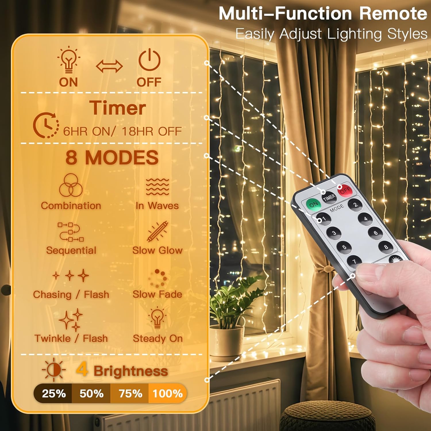 • 150LED 6.5x5FT Curtain Lights: Our fairy curtain lights features 10 transparent light strings and 150 warm white LED lights, making it easy to cover most windows. It projects a soft waterfall like light and shadow effect, perfect for adding warmth to any space and transforming ordinary spaces into enchanting fairylands.