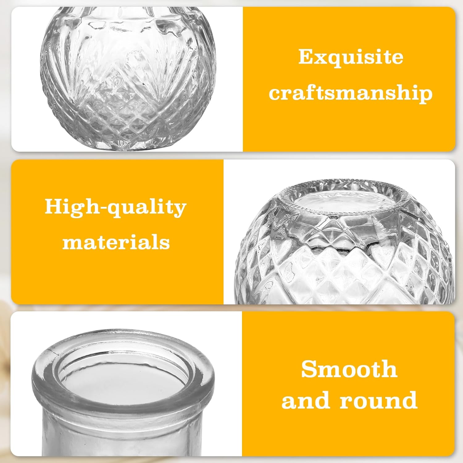 • Premium Glass: The small flower vases are made from thick, sturdy glass for enhanced durability and resistance to breaking. A weighted, thickened base provides stability to prevent tipping. They have a smooth finish, a sleek feel, and polished rims