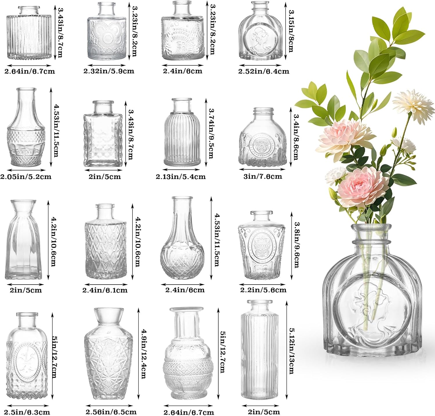 • Package Includes: You will receive 16 unique shapes and sizes of mini bud vases in bulk. Ideal for small floral arrangements, each vase is petite—ranging from 3.15" to 5.12" in height and 2" to 3" in width—and ideal for displaying 1 to 3 flowers