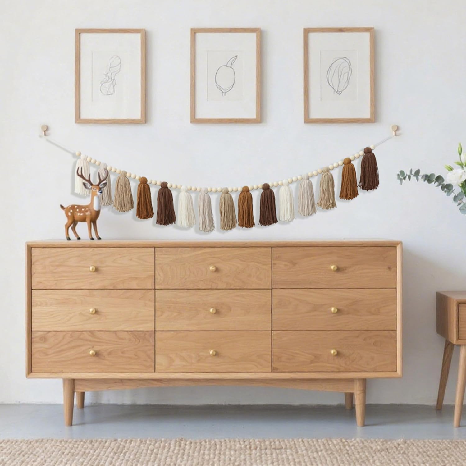 • Packing list: A handmade tassel garland made of yarn tassels and wooden beads in various colors such as terracotta brown; unique bohemian style elements; soft tones; presenting western decorative aesthetics
