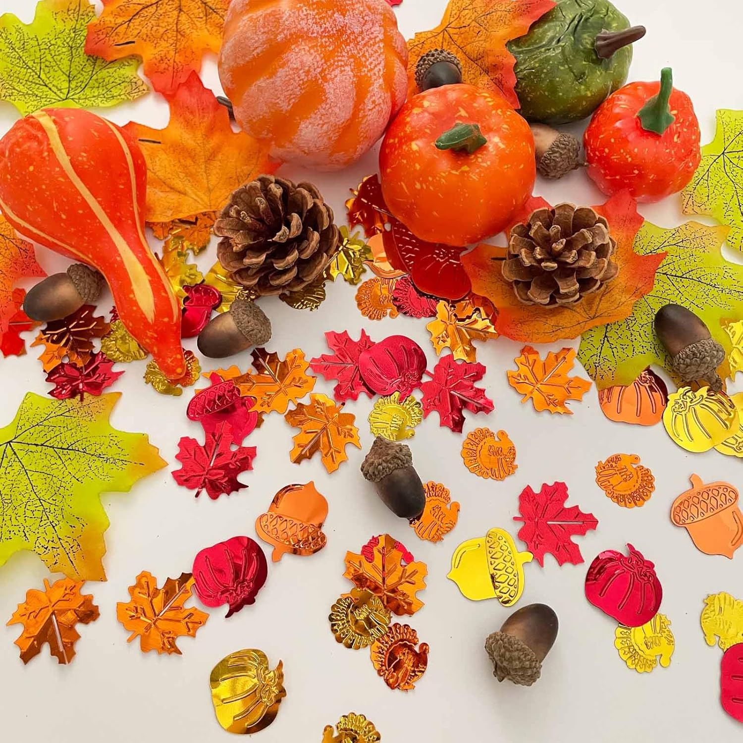 • Thanksgiving Table Glitter: Includes 20mm shaped confetti pieces featuring turkeys, pumpkins, maple leaves, and pinecones for perfect autumn table decor
