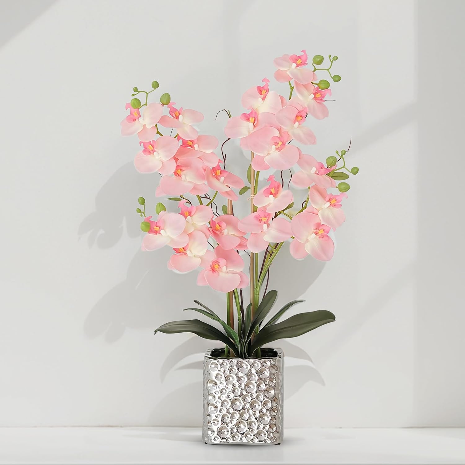 Orchid Artificial Flowers with Sliver Vase Large Silk Faux Phalaenopsis Flowers for Dining Room Table Floral Centerpieces Indoor Decoration,Pink