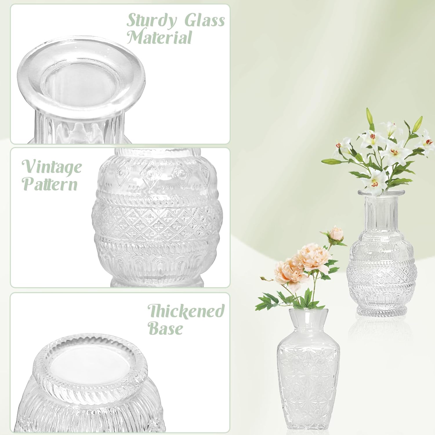 • Vintage Rustic Design: this 12pcs mini glass bud vases set with the unique design style,and each small vase is crafted different exquisite pattern,which are both simple and fashionable.The different designs,heights, and shapes make this collection interesting when you use it in the different event or home decor