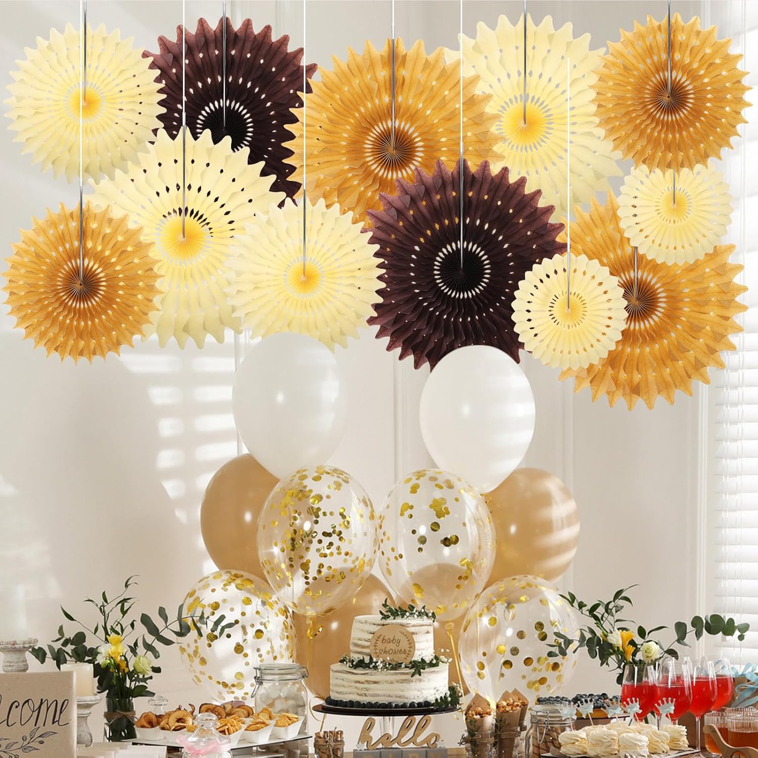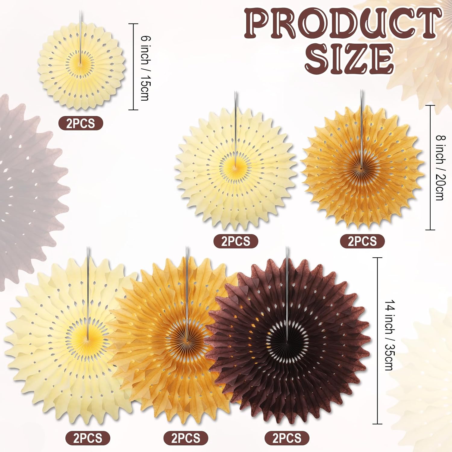 Outus 12 Pcs Hanging Honeycomb Paper Fans Sets, Fiesta Brown and Beige Party Decorations, Tissue Paper Flowers Supplies for Birthday Wall Classroom Wedding Bridal Photo Backdrop (14/8/6 Inch)