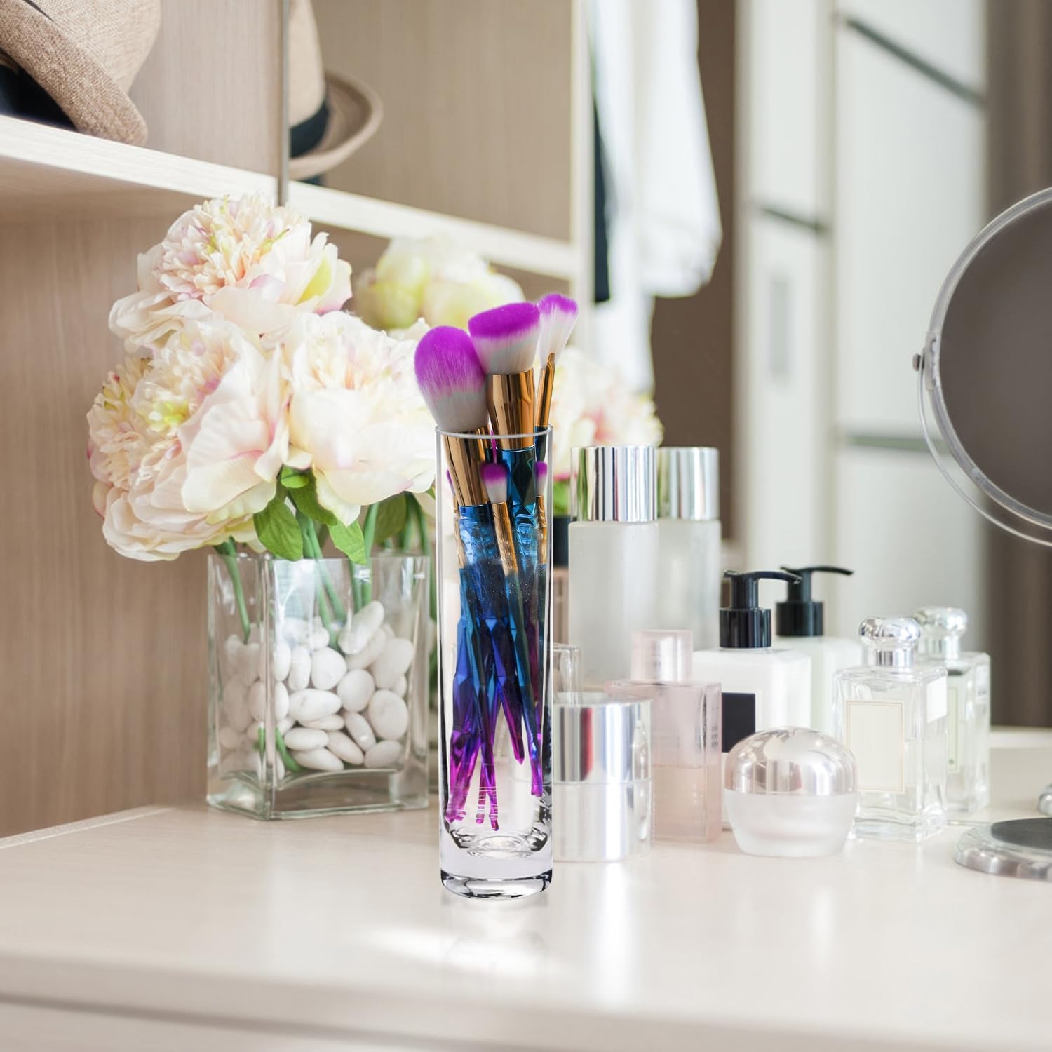 • Widely used -- This cylinder glass vase can be filled fresh flowers, dried flowers, rose, floating candles, pillar candle, lighting decoration, or make up brushes storage, this clear flower vase also liquid filled & can be used for kinds of decors needs