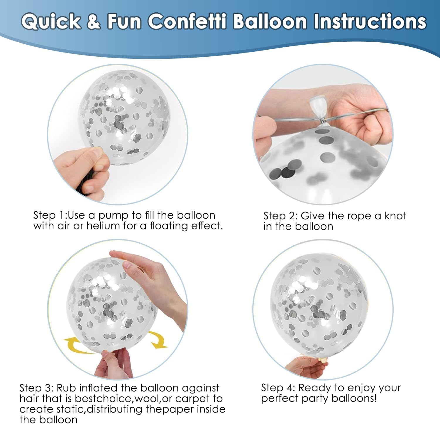• 【Metallic Blue Balloons 】This blue and white confetti balloons set come with : 10pcs navy blue balloons, 10pcs metallic blue latex balloons, 10pcs sand white balloons,10pcs metallic silver latex balloons, 10pcs clear white with silver Confetti, one blue ribbon (33 feet total). Offering you a good choice for making nice indoor or outdoor decoration, to create more joyful time for families and friends.