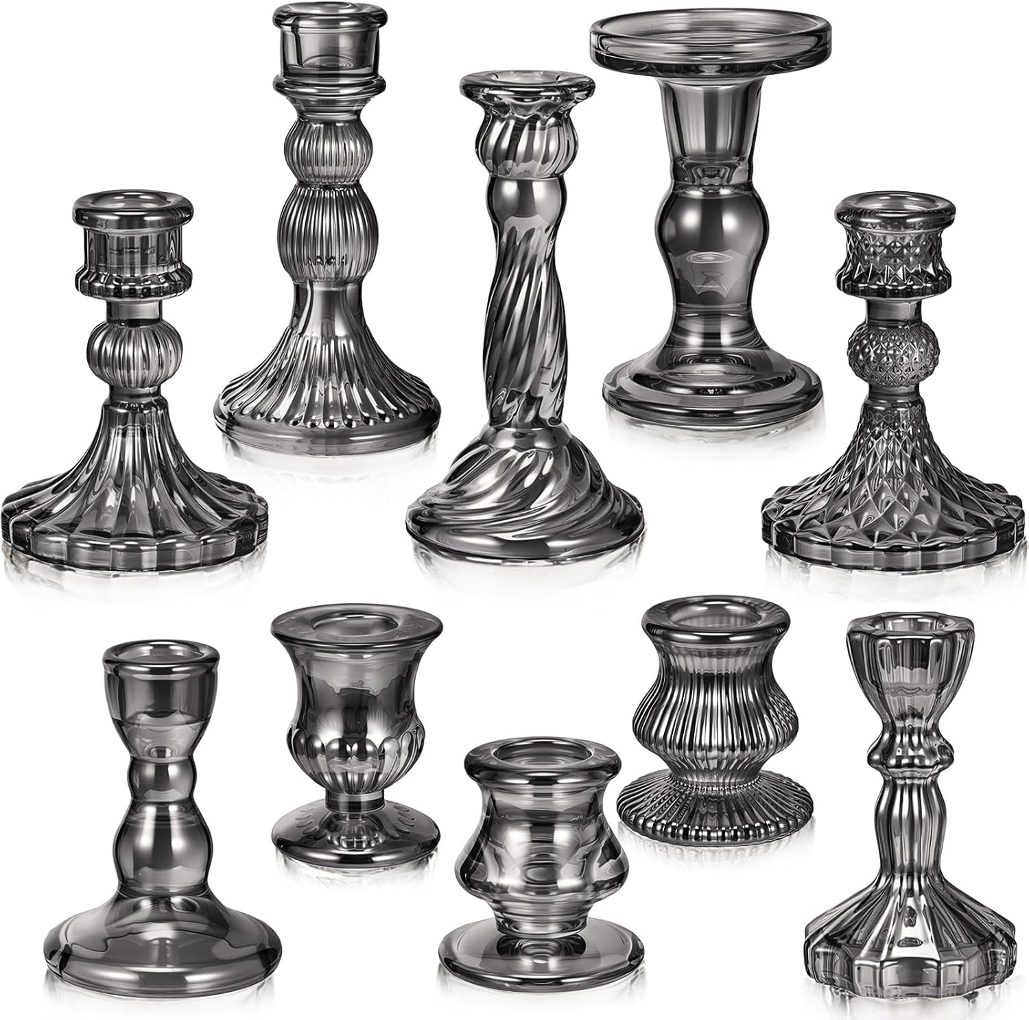 • Package Contents: you will receive 10 pieces 10 style black glass candle holders in different sizes, which have different heights, smooth shapes and smooth finishes; The candlestick holder add a clean, and elegant aesthetic to any space, it is suitable for a variety of candles