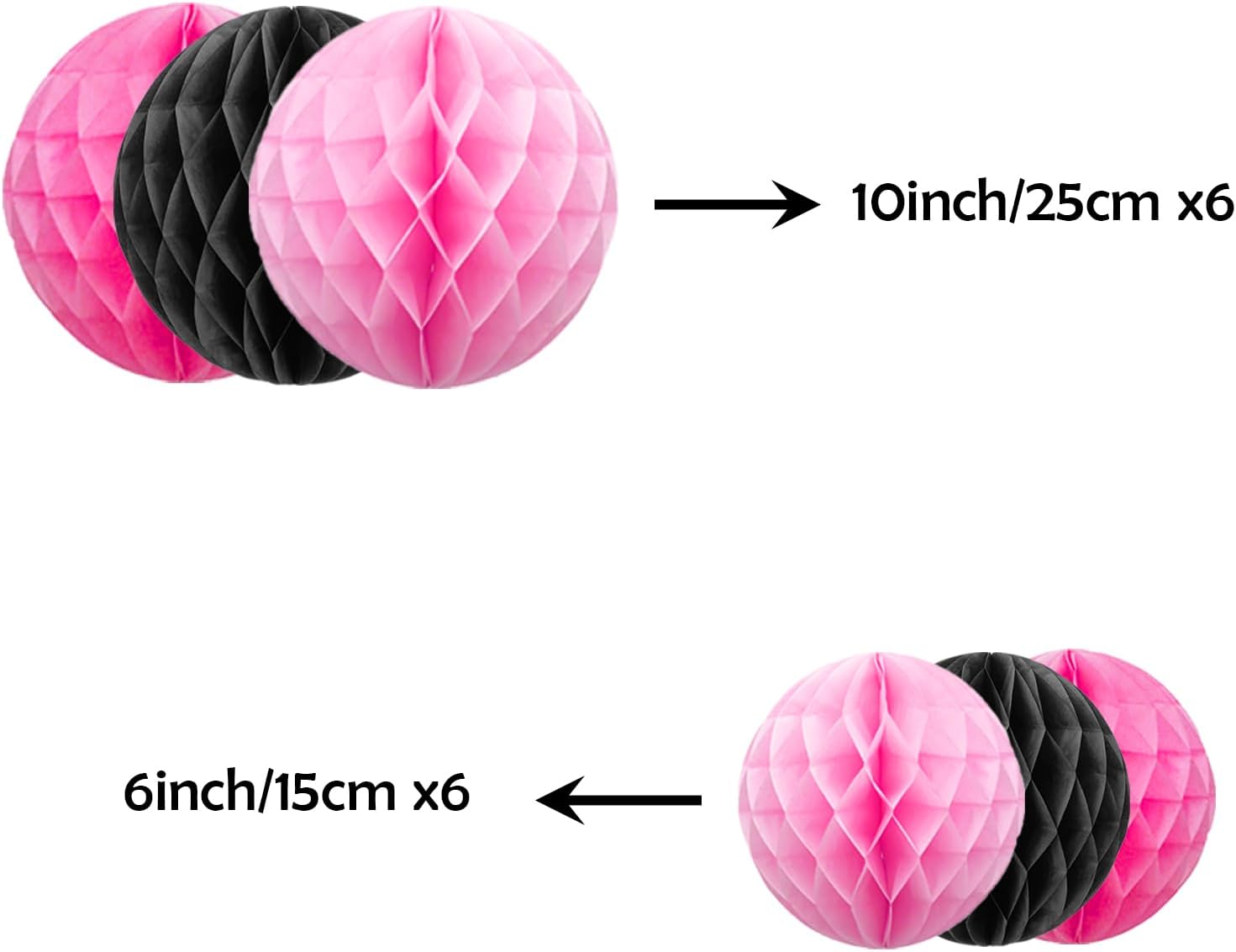 • HONEYCOMB DECORATIONS Package includes: 2 pcs 10" dark pink, 2pcs 10" pink and 2 pcs 10" black, 2pcs 6" dark pink,2pcs 6" pink and 2pcs 6"black honeycomb ball decorations.