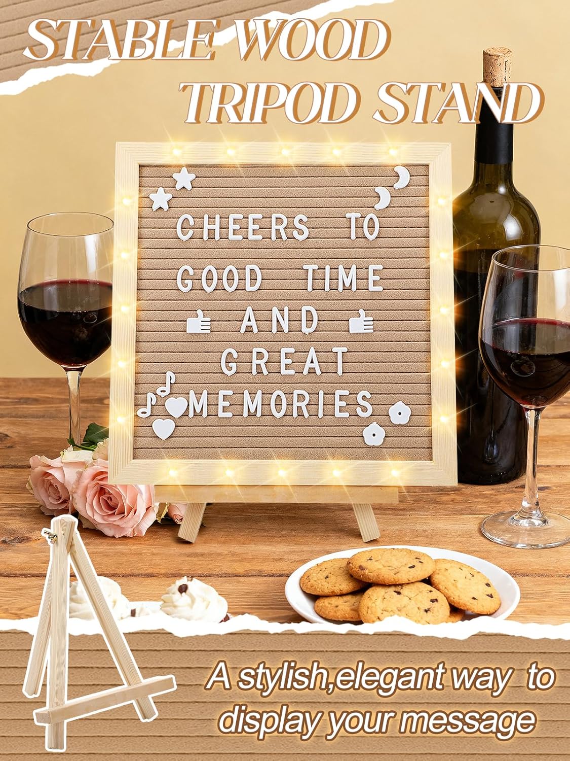 Light up Changeable Felt Letter Board Sign with LED Lights - 10×10" Message Board & Wood Stand & 450 Letters, for Halloween/Birthday/Event/Pregnancy/Baby Announcement/Home Wall Decor Gifts, Camel