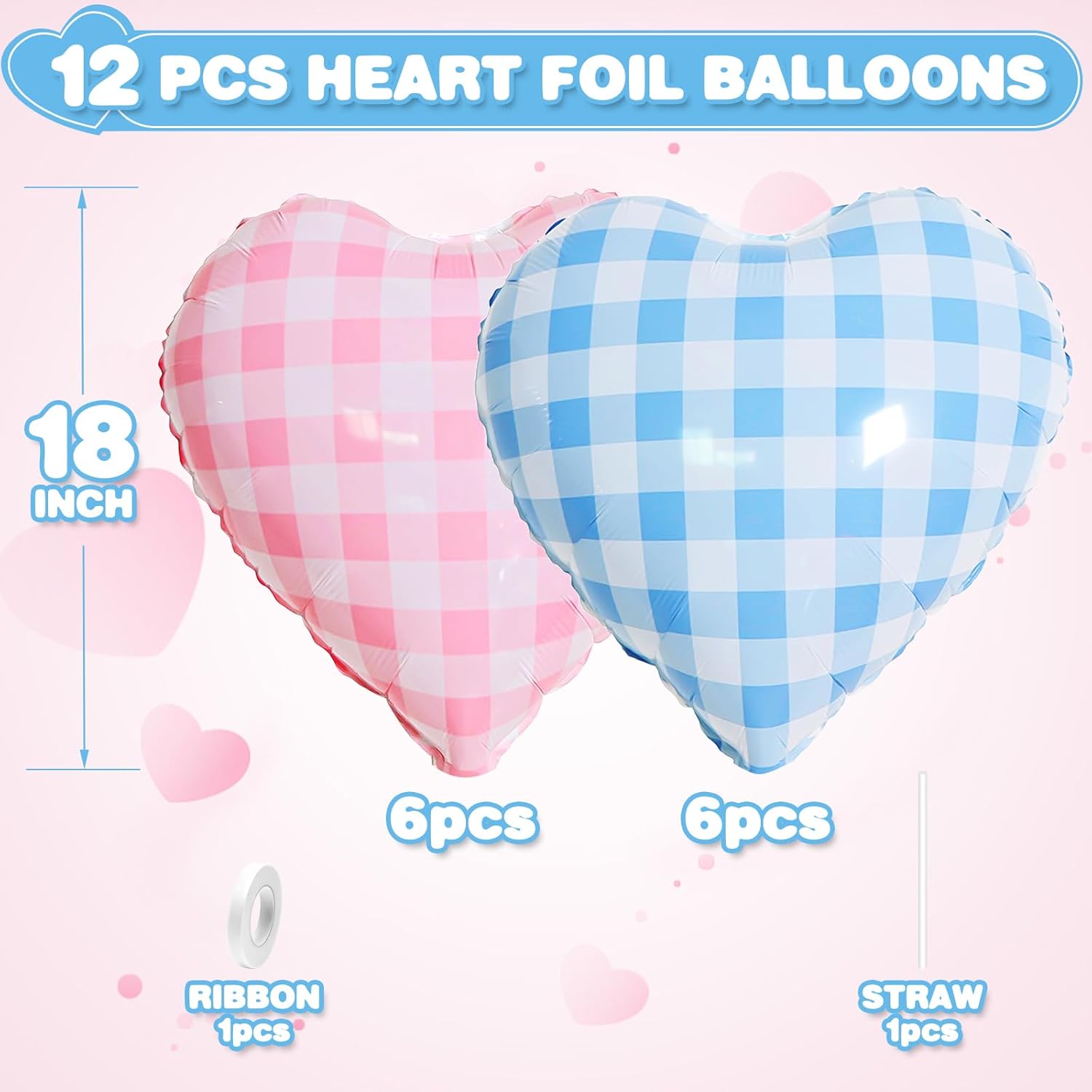 • 12PCS HEART BALLOONS:Package include 6pcs blue white checkered heart foil balloons,6pcs pink white checkered heart foil balloons,1pc straw.Large enough to help you better decorate your party.