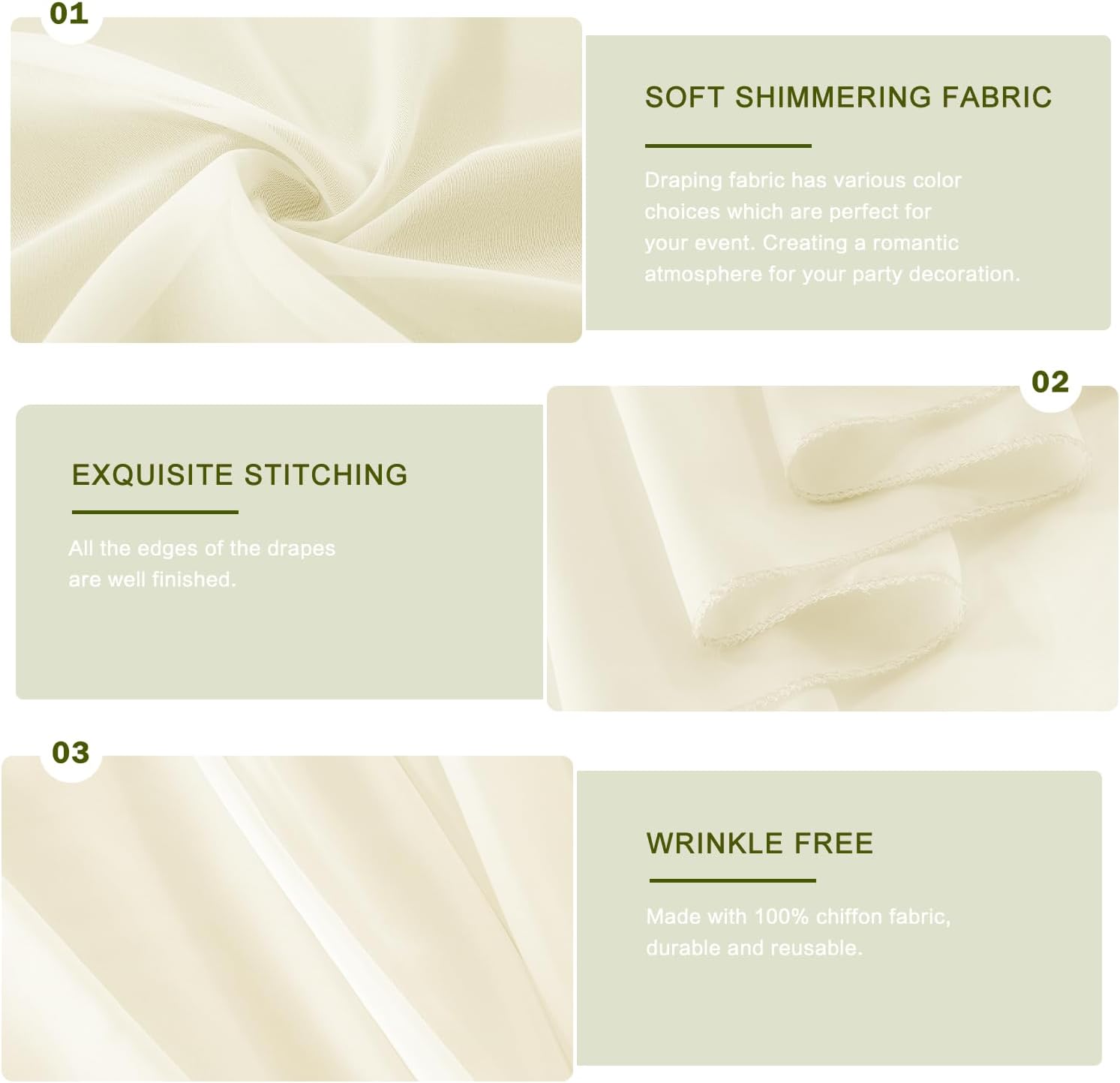 • Material: The Sheer Drapes are made of high quality chiffon fabric, wrinkle-free, touch silky soft and durable.