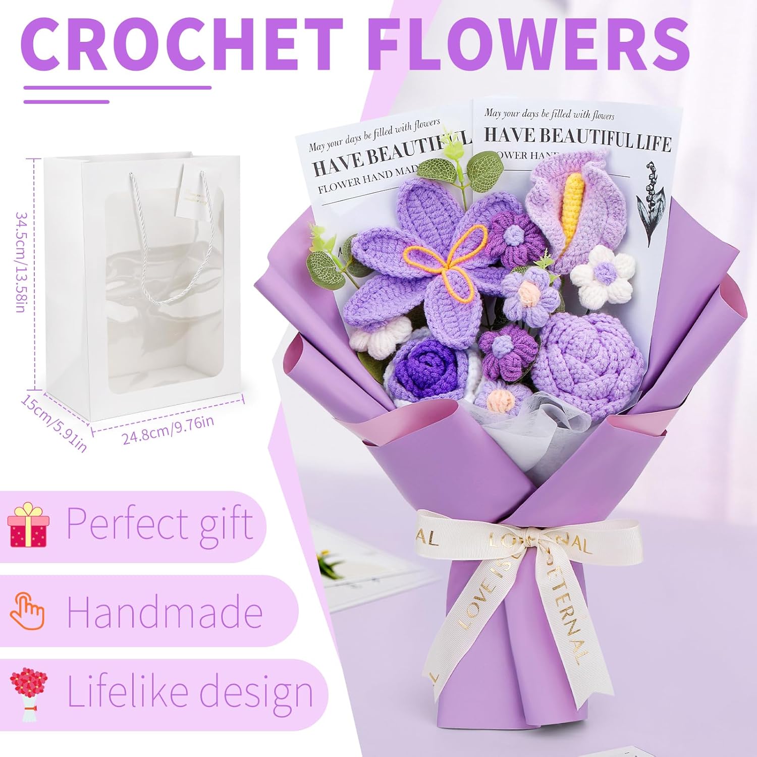 • Handmade Crochet Flower Bouquet: This crochet flowers include tulips, roses, calla lilies, puff flowers and a bunch of eucalyptus leaves. It is 100% hand-crocheted with soft milk cotton thread and is a timeless keepsake.