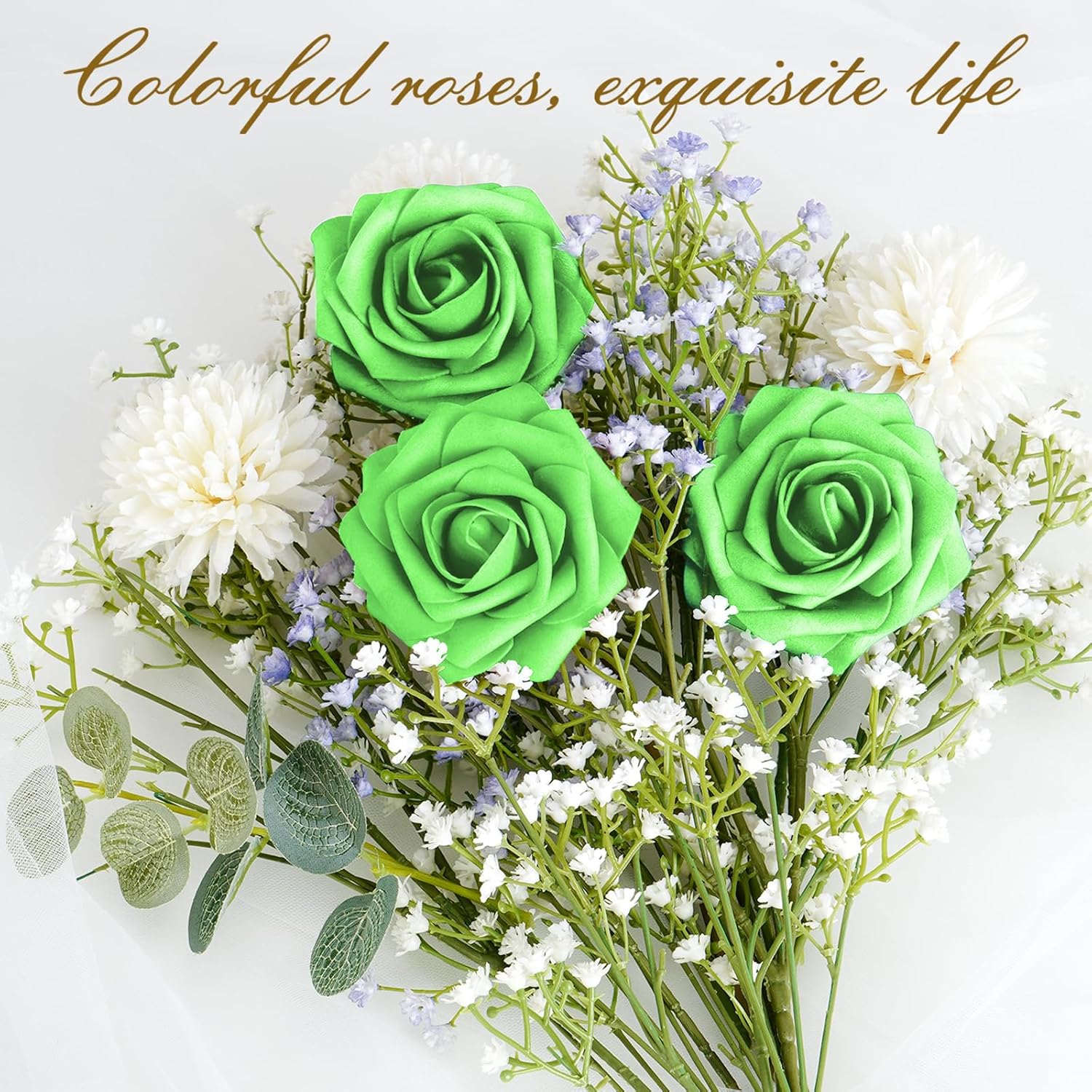 BLEUM CADE 16Pcs Artificial Flowers Fake Roses with Stems, Bright Green Boxed Foam Roses for DIY Bouquets Centerpieces Wedding Party Arrangement Bridal Shower Decor