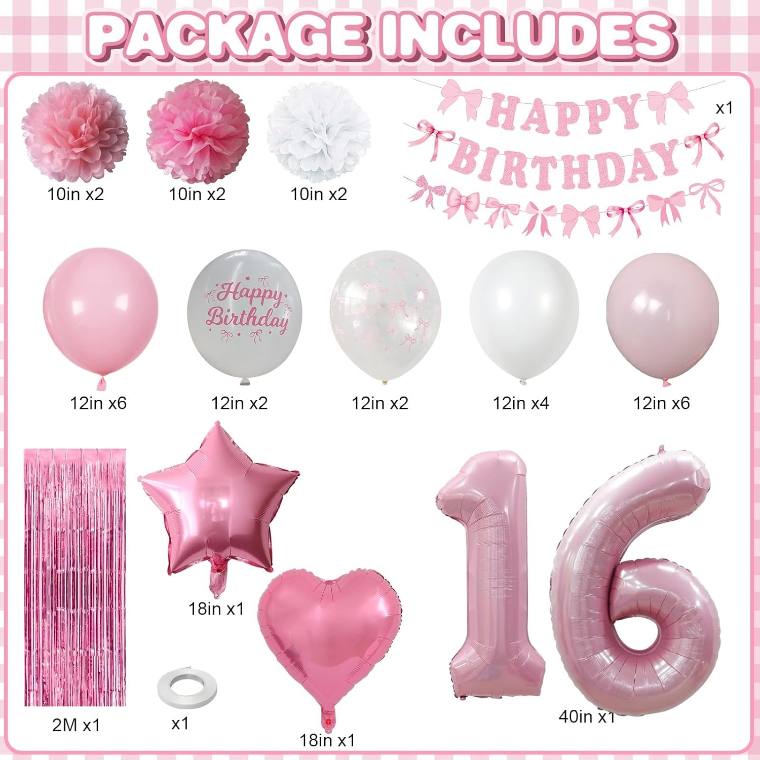 • PACKAGE INCLUDES: 1pc pearl pink number 16 balloon, 1pc bow happy birthday banner, 2pcs pink paper pom poms, 2pcs light pink paper pom poms, 2pcs white paper pom poms, 1pc pink curtain, 1pc light pink star foil balloons, 1pc light pink heart foil balloons,6pcs light pink balloons, 6pcs pastel pink balloons, 4pcs white balloons, 2pcs birthday printed balloons, 2pcs bow clear balloons, 1pc ribbon