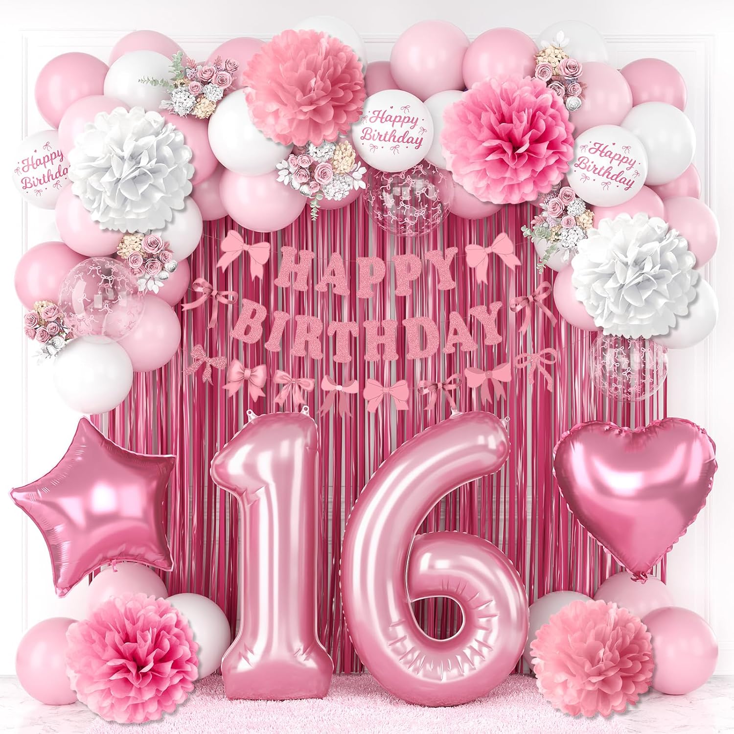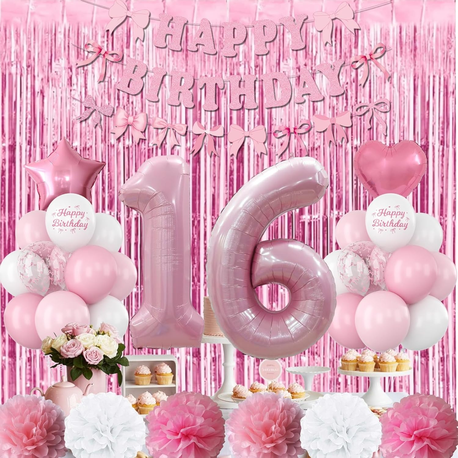• ALL-IN-ONE DECORATION: Includes pearl pink number 16 balloon, bow “Happy Birthday” banner, pom poms, fringe curtain, foil balloons, latex balloons, special printed balloons, and ribbon – a complete set to decorate your party easily; designed especially for girls turning sixteen, this decoration set is ideal for birthday parties, home celebrations, and photography scenes, making the day extra memorable