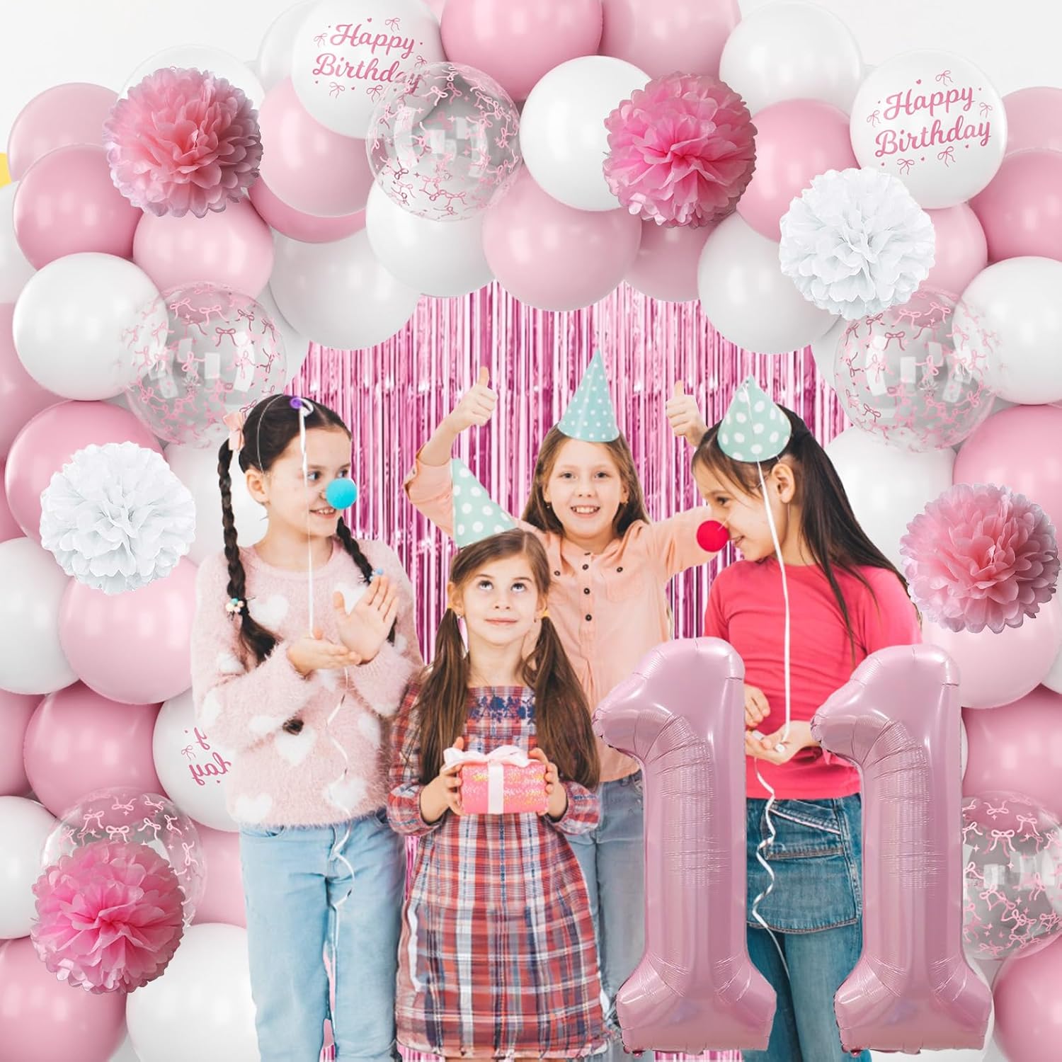 • ALL-IN-ONE DECORATION: Includes pearl pink number 11 balloon, bow “Happy Birthday” banner, pom poms, fringe curtain, foil balloons, latex balloons, special printed balloons, and ribbon – a complete set to decorate your party easily; designed especially for girls turning eleven, this decoration set is ideal for birthday parties, home celebrations, and photography scenes, making the day extra memorable