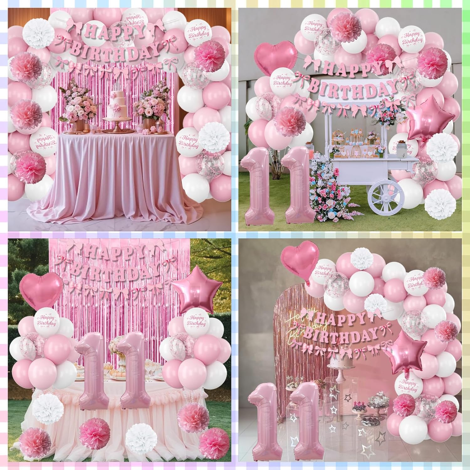 11th Birthday Decorations for Girls Pink Number 11 Balloon Bow Coquette Happy Birthday Banner Fringe Curtain Paper Pom Poms Star Heart Foil Pink White Balloons 11 Year Old Party Decor