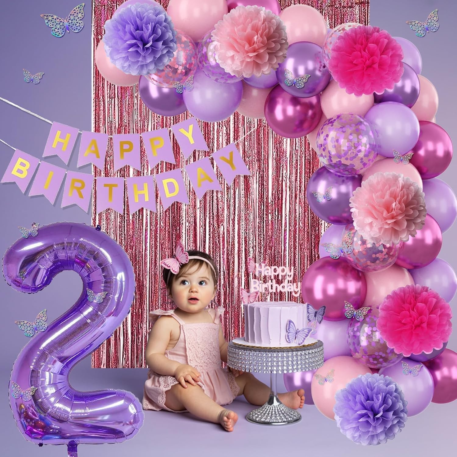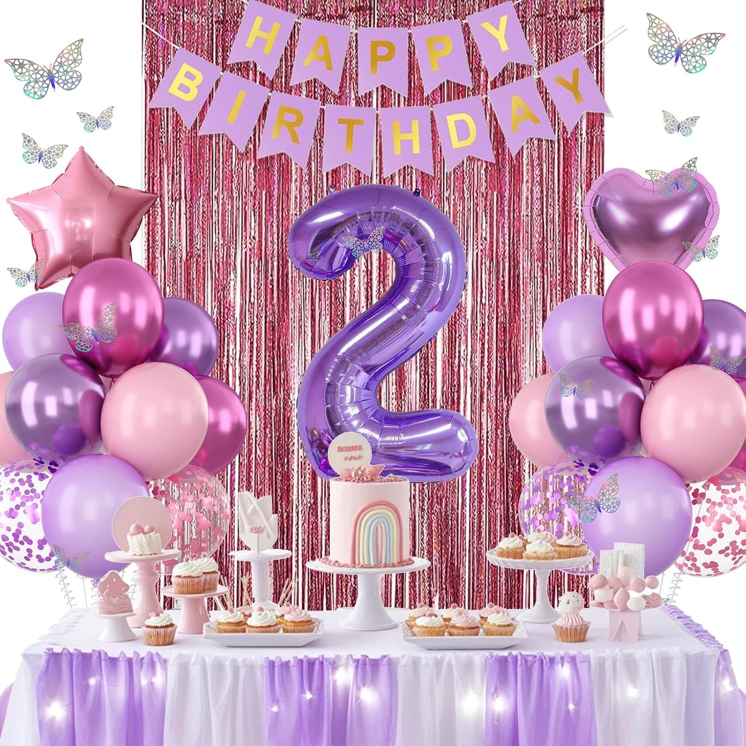 • PACKAGE INCLUDES: 1pc purple number 2 balloon, 1pc happy birthday banner, 2pcs light pink paper pom poms, 2pcs light purple paper pom poms, 2pcs hot pink paper pom poms, 1pc light pink fringe curtain, 1pc light pink star foil balloons, 1pc light purple heart foil balloons, 6pcs pastel purple balloons, 6pcs pastel pink balloons, 4pcs metallic purple balloons, 4pcs metallic magenta balloons, 3pcs purple confetti ballons, 3pcs pink confetti ballons, 1pc butterfly stickers set, 1pc ribbon