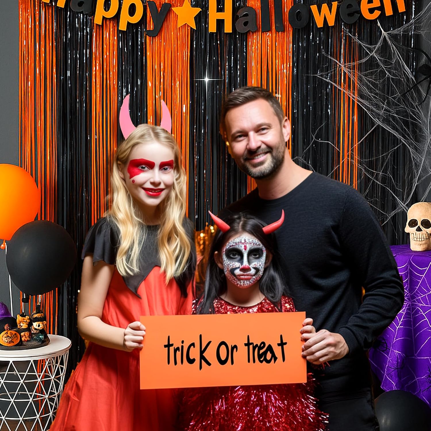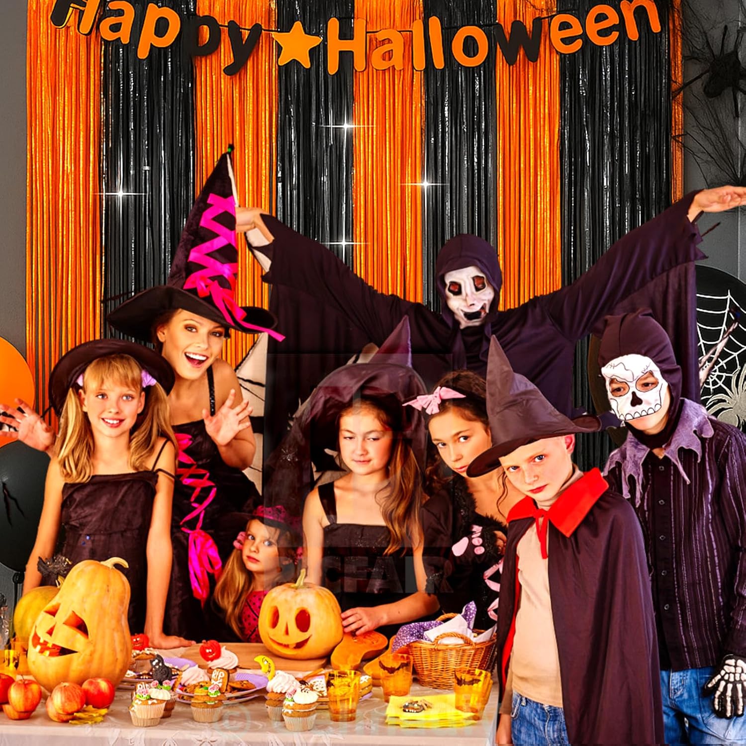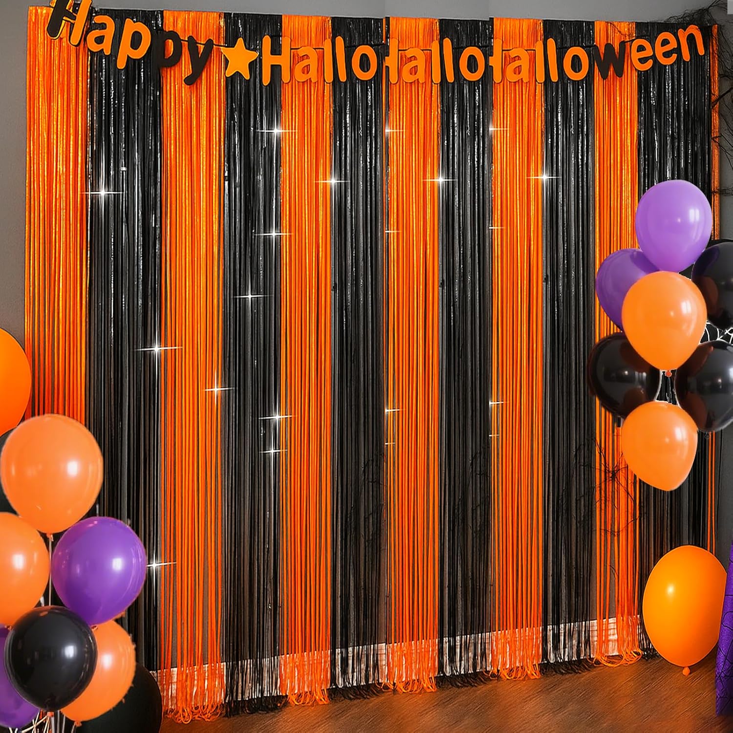 4 Packs Halloween Foil Fringe Curtain, Orange and Black Metallic Tinsel Backdrop for Birthday, Baby Shower, Bachelorette, Halloween Party Decorations Favors Supplies Indoor Outdoor