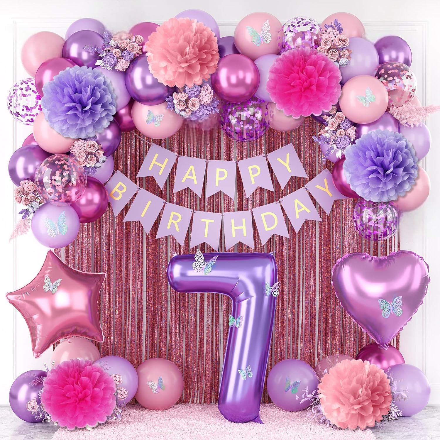 • PACKAGE INCLUDES: 1pc purple number 7 balloon, 1pc happy birthday banner, 2pcs light pink paper pom poms, 2pcs light purple paper pom poms, 2pcs hot pink paper pom poms, 1pc light pink fringe curtain, 1pc light pink star foil balloons, 1pc light purple heart foil balloons, 6pcs pastel purple balloons, 6pcs pastel pink balloons, 4pcs metallic purple balloons, 4pcs metallic magenta balloons, 3pcs purple confetti ballons, 3pcs pink confetti ballons, 1pc butterfly stickers set, 1pc ribbon