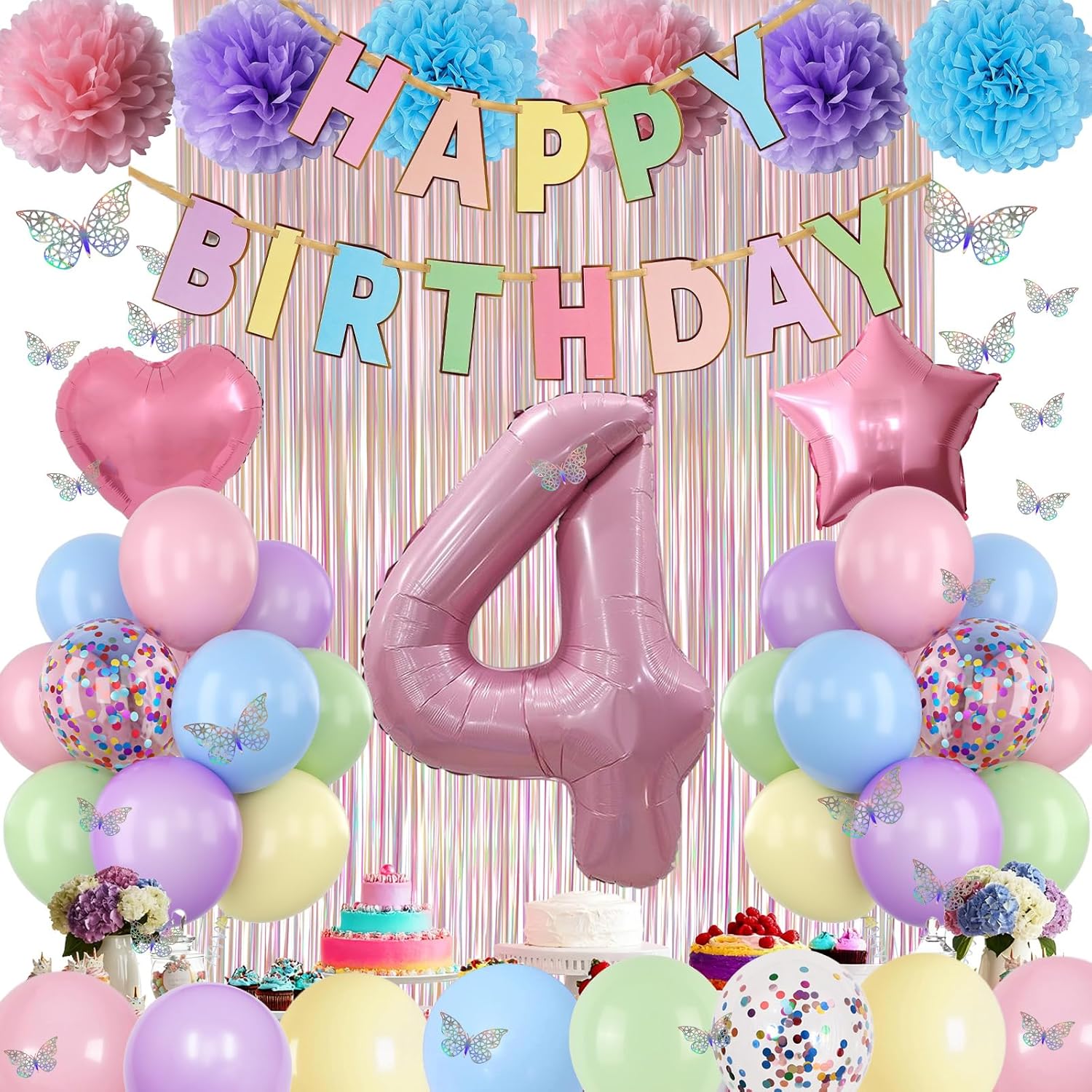 • PACKAGE INCLUDES: 1pc pearl pink number 4 balloon, 1pc happy birthday banner, 2pcs light pink paper pom poms, 2pcs light purple paper pom poms, 2pcs light blue paper pom poms, 1pc colorful white curtain, 1pc light pink star foil balloons, 1pc light pink heart foil balloons, 4pcs pastel purple balloons, 4pcs pastel pink balloons, 4pcs pastel blue balloons, 4pcs pastel green balloons, 4pcs pastel yellow balloons, 4pcs colorful confetti balloons, 1pc butterfly stickers set, 1pc ribbon