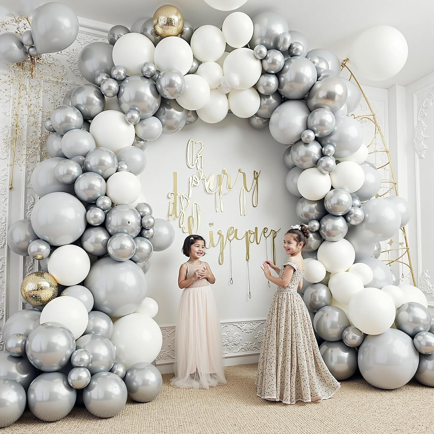 • Package List : white and silver balloon garland kit includes 18" White/Metallic silver balloons(12 pcs), 12" White/Metallic silver balloons(100 pcs), 10"White/Metallic silver balloons(100 pcs), 5" White/Metallic silver balloons(100pcs),glue dotsx200, ribbonx2, decorative stripx2. plenty in quantity.