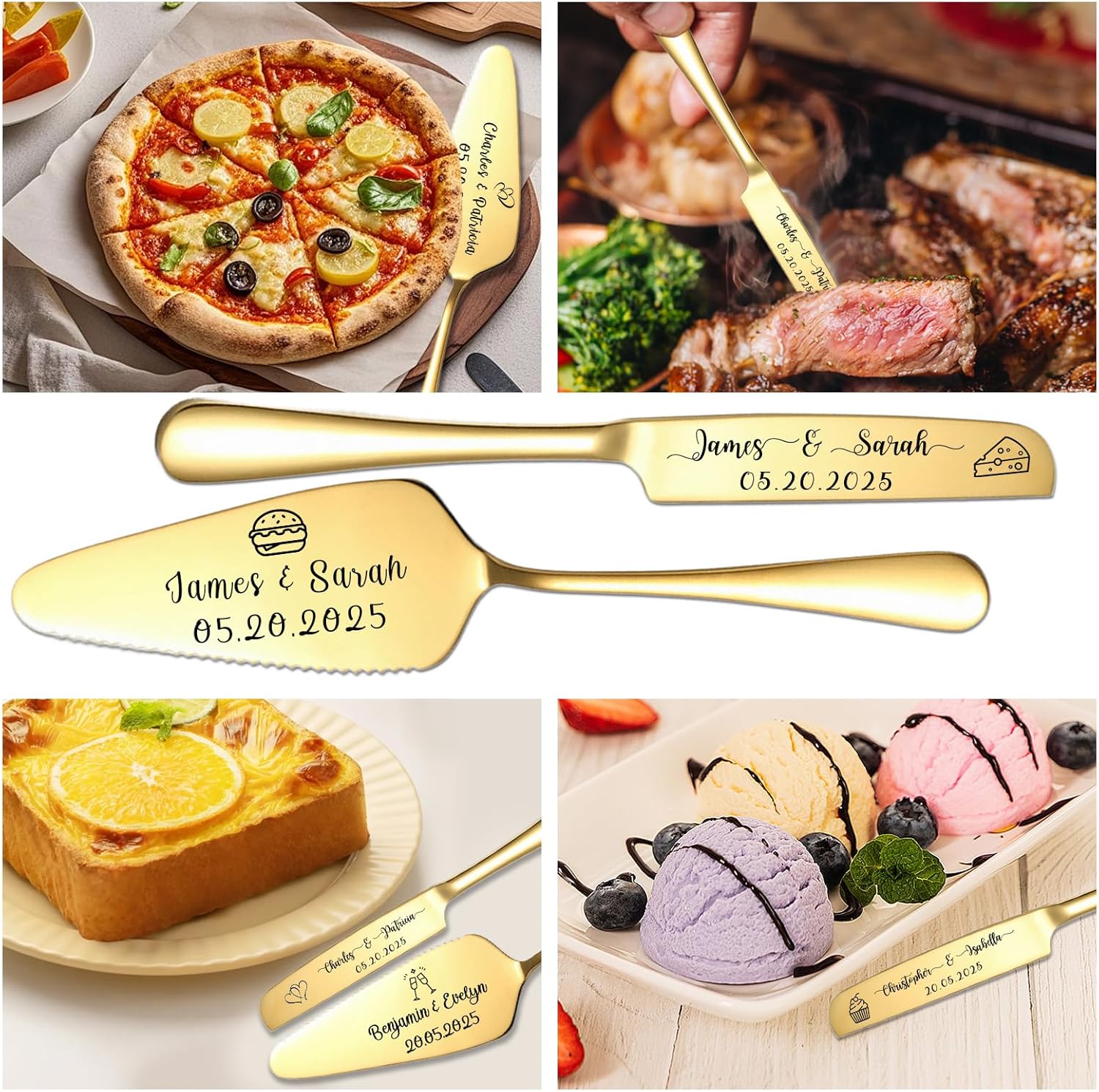 • Cake Knife and Server Set: The personalized cake cutting set adopts a multifunctional design and is also suitable for daily use. Its wavy blade with a triangular shovel surface can not only neatly cut out multi-layered desserts, but also firmly hold up block-shaped food. Whether it is a wedding cake, fruit pie, pizza, pancakes, omelets, etc., it can make every meal full of ritual