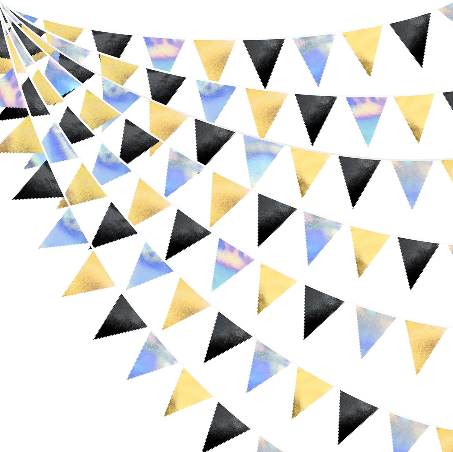 • Package Contains - 1 packs of iridescent black gold party pennant banner, Size of each flag is 7.9 x 5.9 inch.Total 9.75meter/32feet with 36pcs flags.