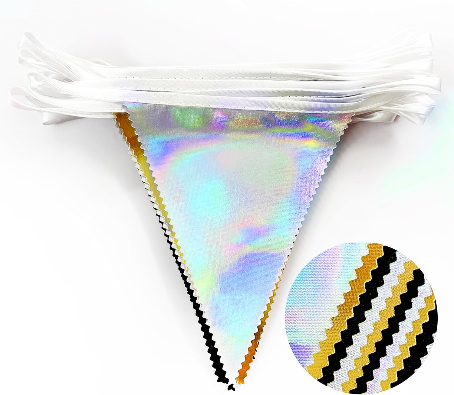 • Environmental Material - Our iridescent gold black triangle flag bunting are made with double-sided metallic holographic fabric,Unique wavy neat cut,soft and comfortable touch.safe and odorless,washable and waterproof,durable and reusable.