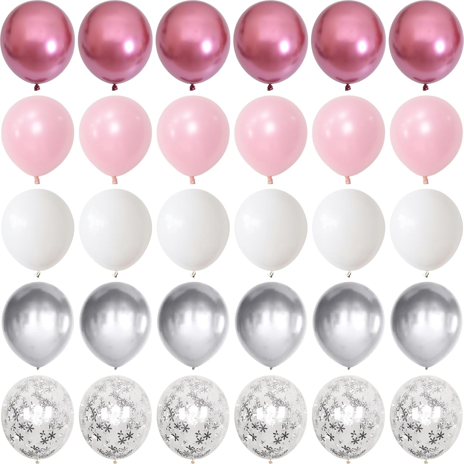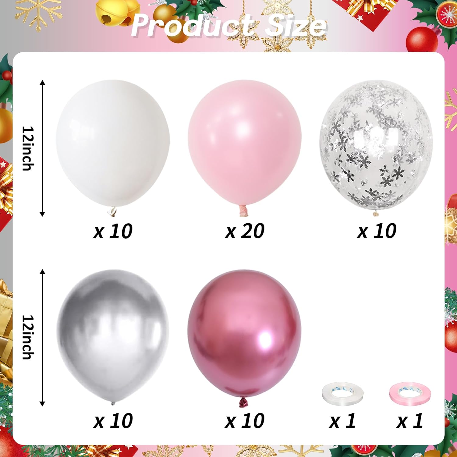 • Party Balloons Set: The pink winter wonderland balloons set have 60pcs 12inch helium balloons, include 20pcs pearl white & pink double stuffed balloons, 10pcs white balloons, 10pcs metallic chrome silver balloons, 10pcs metallic chrome hot pink balloons, 10pcs snowflakes confetti balloons, and balloon ribbon(white *1, pink *1).