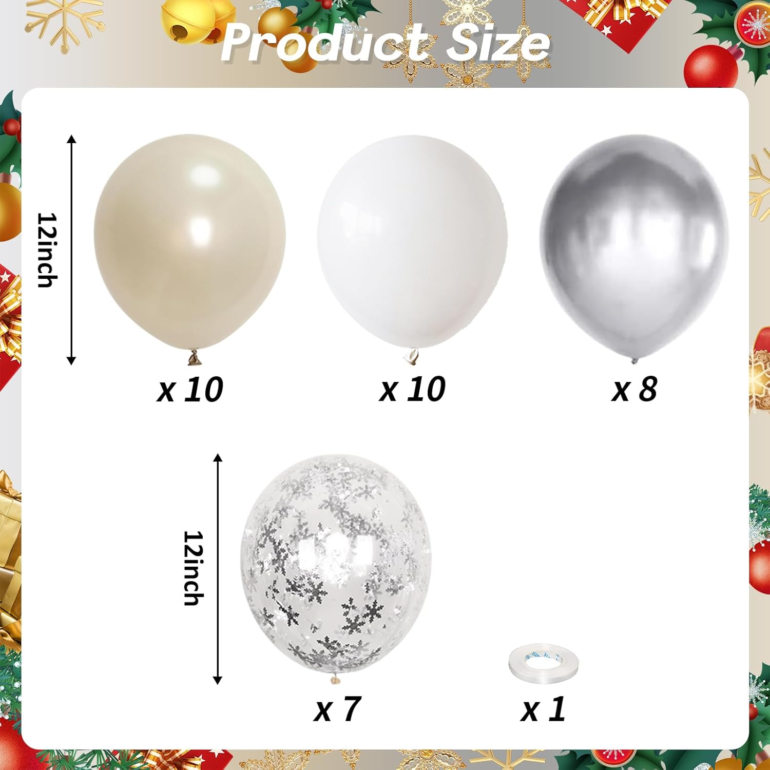 • Party Balloons Set: The pearl white and silver winter wonderland balloons set have 35pcs 12inch helium balloons, include 10pcs pearl white sand balloons, 10pcs white balloons, 8pcs metallic chrome silver balloons, 7pcs snowflakes confetti balloons. The set comes with 1pc balloon ribbon to help you easily build balloon garland or arch.