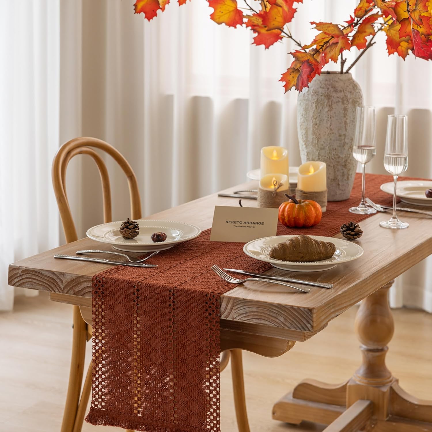 Boho Rust Table Runner for Home Decor 12x48 Inches Farmhouse Macrame Burlap Jute Rustic Dining Kitchen Centerpiece Bohemian Decor French Country Baby Bridal Shower Decorations