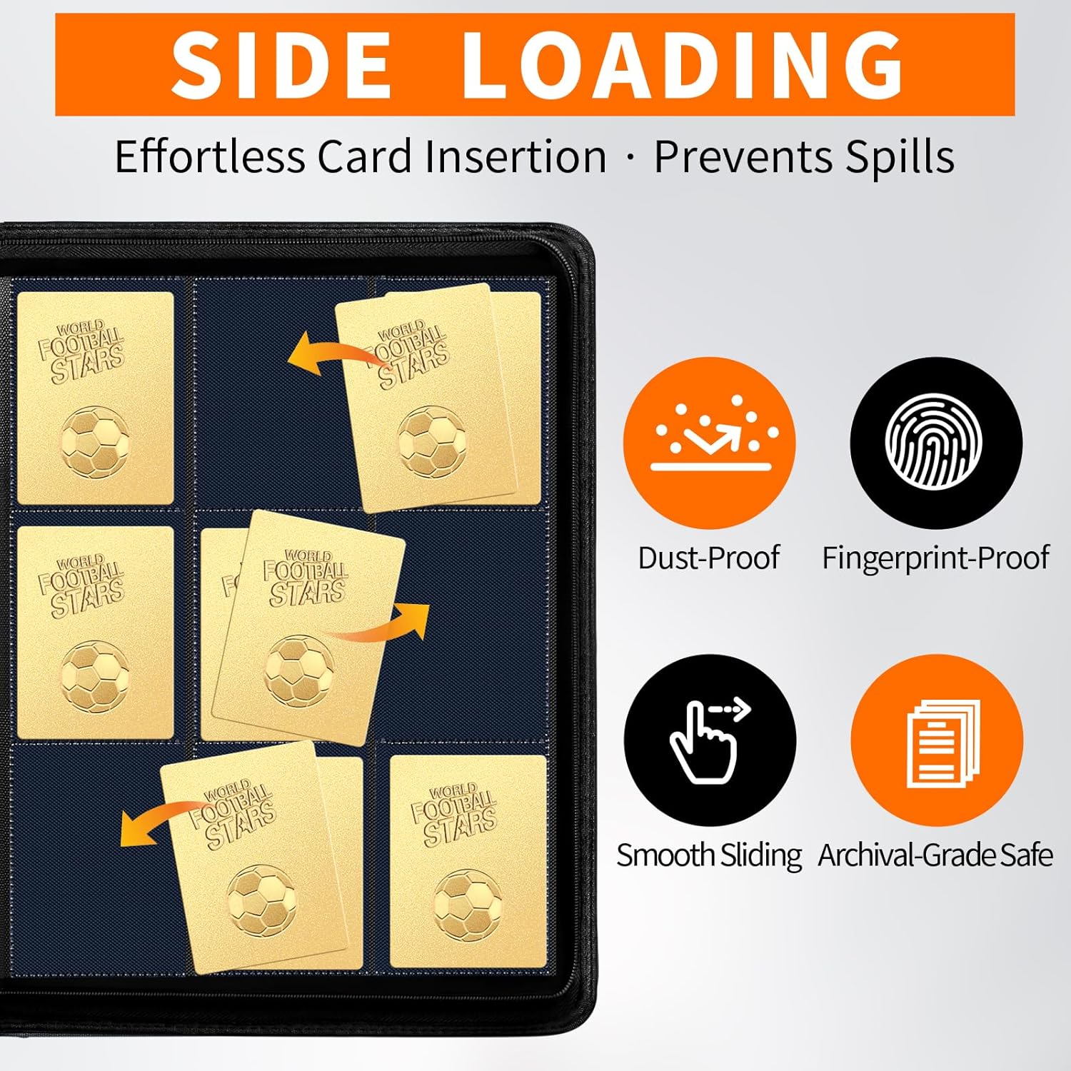 • 【Side-Loading Slot Design】No more struggling to force cards in! This Card Binder’s side-loading structure makes inserting cards a breeze, and the widened middle section prevents first-column cards from bending. Flip pages worry-free at tournaments—its spill-resistant design pairs with smooth card access.