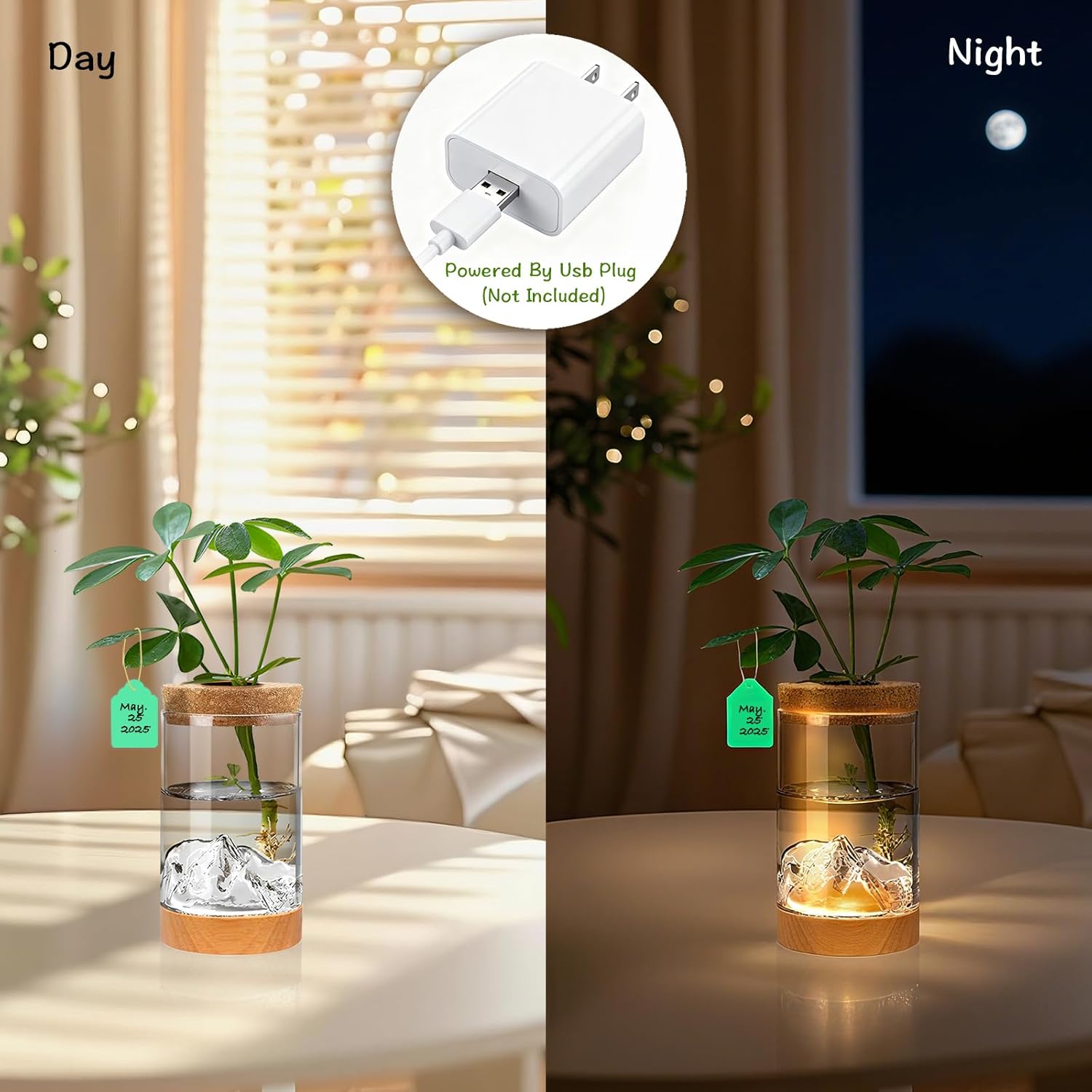 • Luminous Solid Wood Base: Every plant propagation station comes with a premium solid wood base that emits soft warm light. The light not only delivers essential illumination to plant roots in your plant vivarium but also provides gentle heat to boost healthier growth. Powered by USB and controlled via a separate switch, this base lights up the entire propagation vases for plants, elevating both function and ambiance.