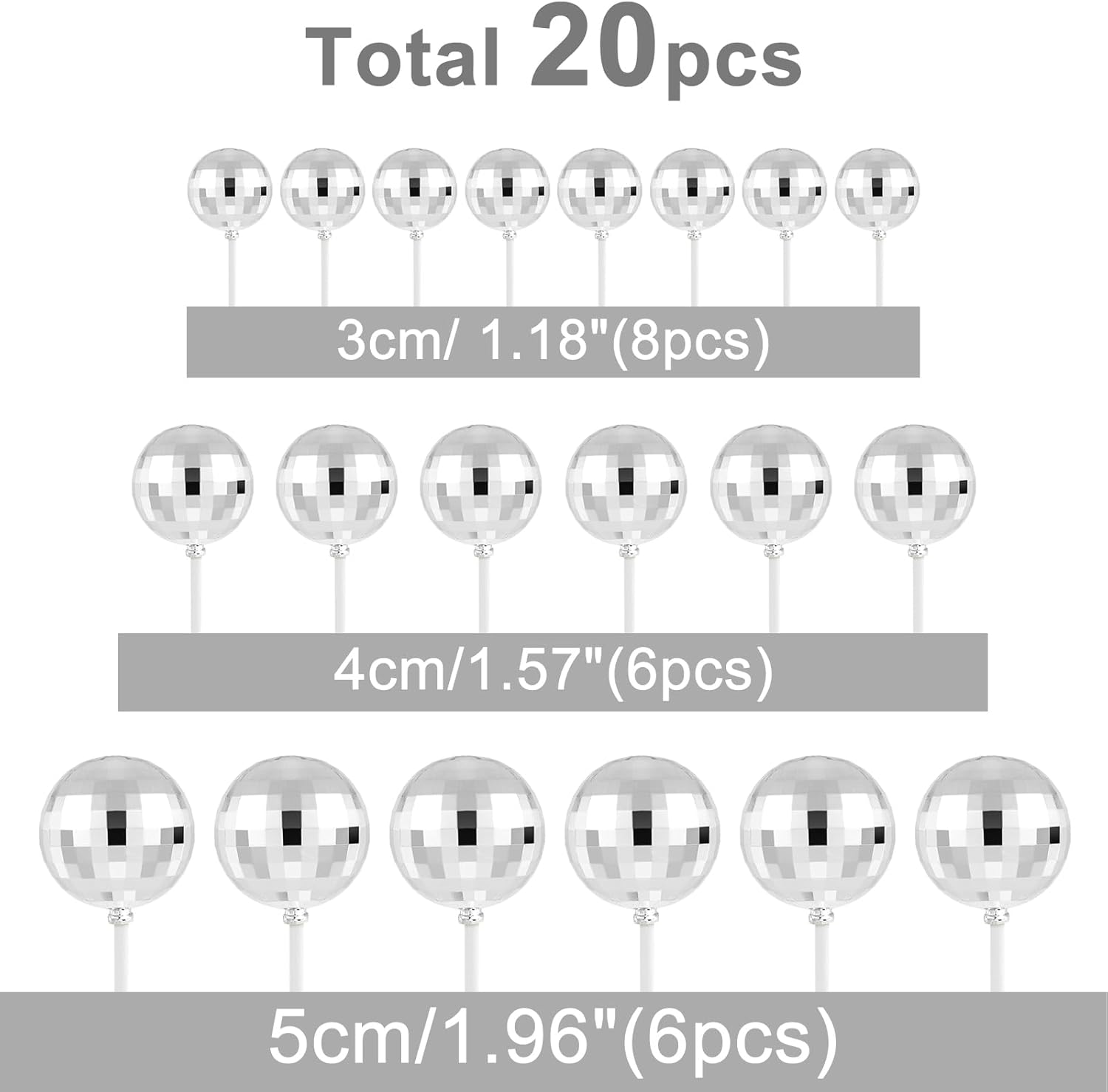 ASTARON 20 Pcs Disco Ball Cake Topper Decorations Sticks Silver Cake Balls Picks Toppers for Birthday Anniversary Disco Retired Theme Party Decorations