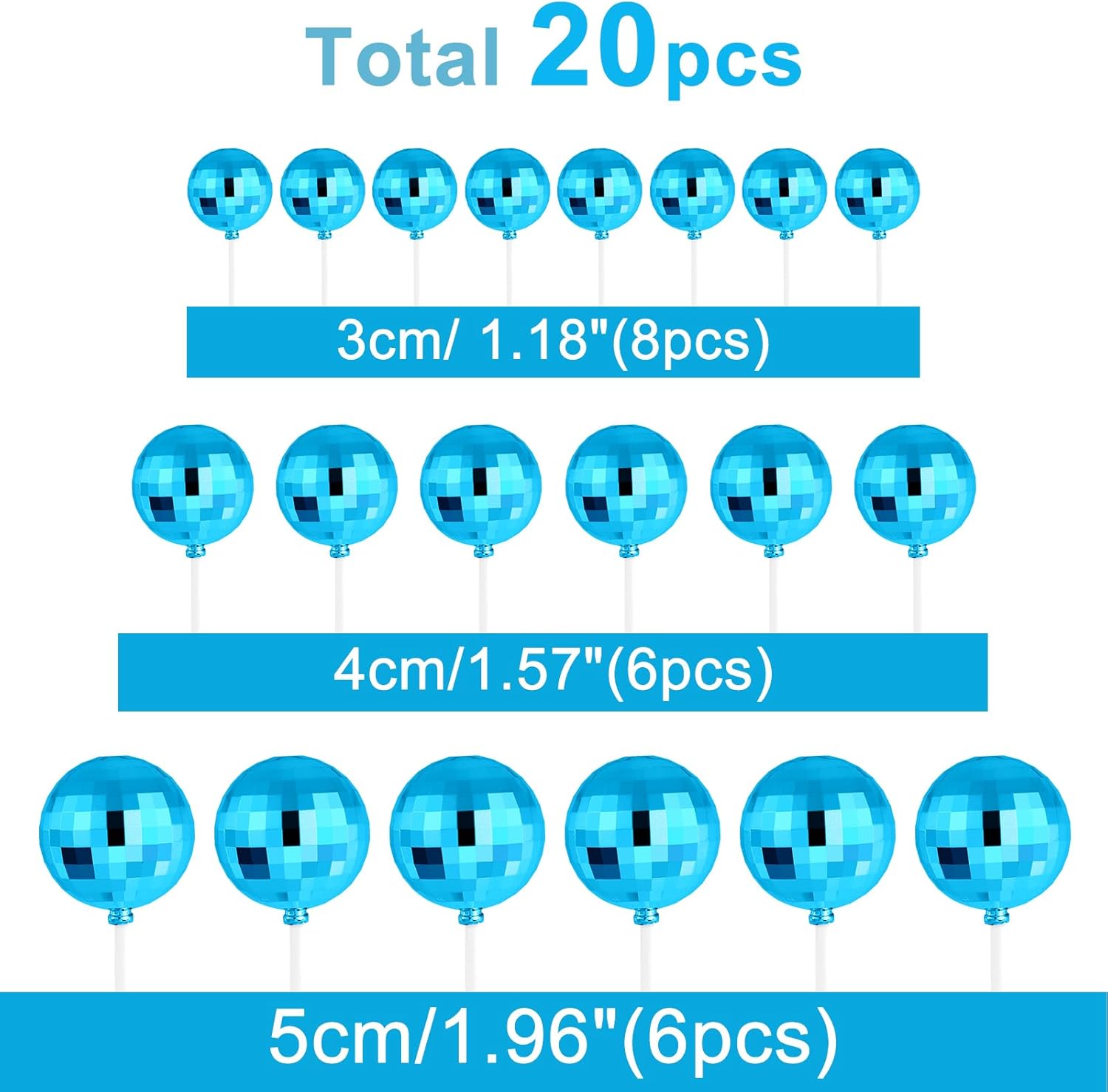 • Package includes: 20 pcs blue disco balls for cake decorations. there are 8 balls with a diameter of 1.18 inches/ 3 cm, 6 balls with a diameter of 1.57 inches/ 4 cm,6 balls with a diameter of 1.96 inches/ 5 cm.
