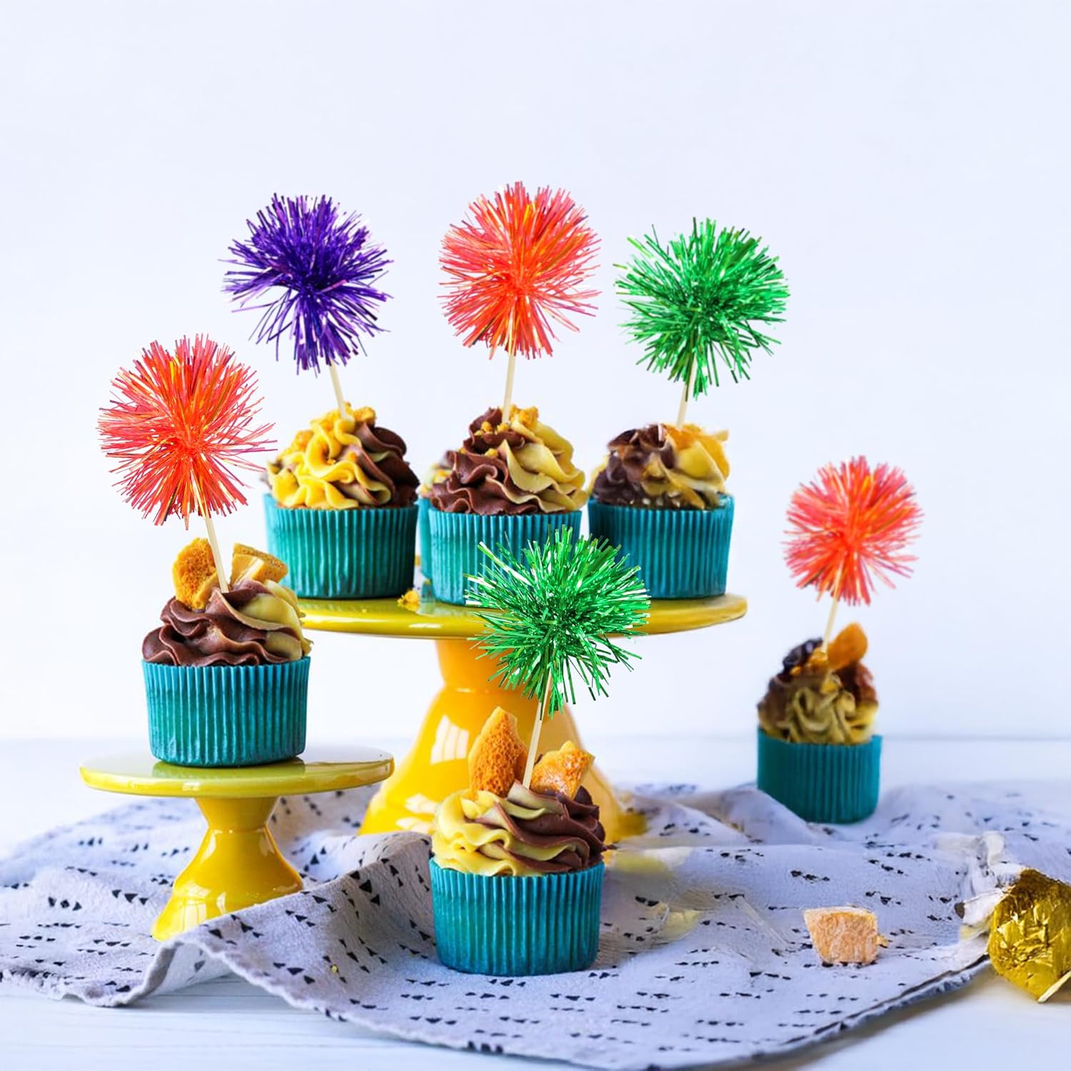 Gyufise 30Pcs Foil Firework Cupcake Toppers Sparkle Tinsel Cake Toppers Tinsel Drink Cake Decoration Cocktail Picks for Halloween Birthday Wedding Graduation Party Supplies Purple Green Orange