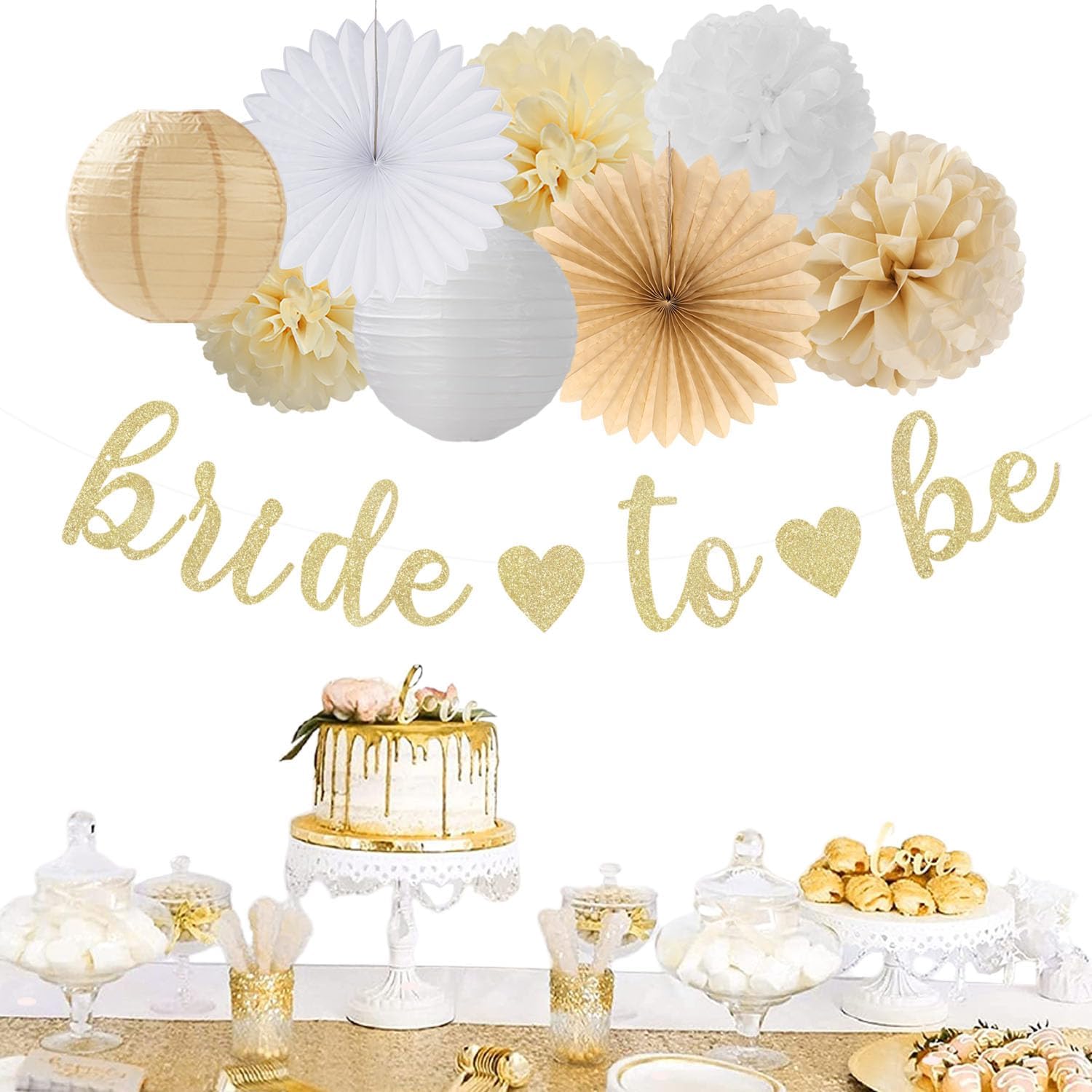 • 【Package Content】Champagne gold white fall bridal shower party decorations contains: 1 pcs bride to be banner, 1 pcs circle dots paper banner, 2 pcs hanging paper lanterns, 4 pcs tissue paper pom poms, 2 pcs paper fans, 6 paper swirls and 15 pcs tassel garland, total 31 pcs in 8 10 12 inch and champagne gold white peach color.