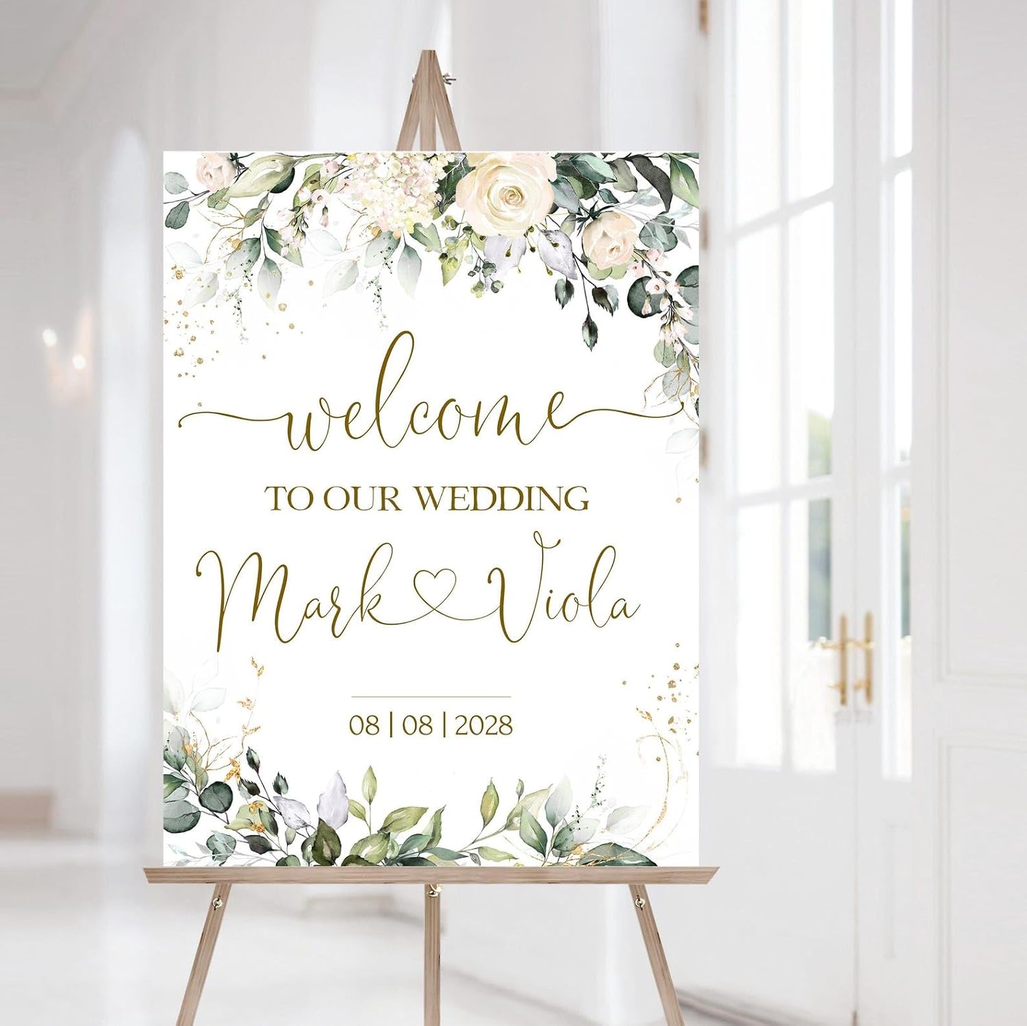 Welcome Wedding Sign Personalized, Minimalist Ivory Floral Wedding Sign Decorations Signage 12" X 18" (Small), 27" (Medium), 36" (Large), Plastic, Modern, Pole Mount, Weather