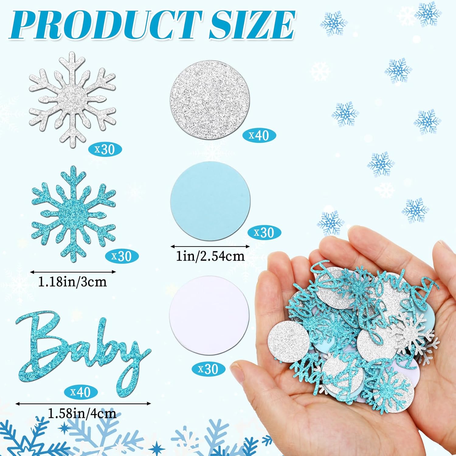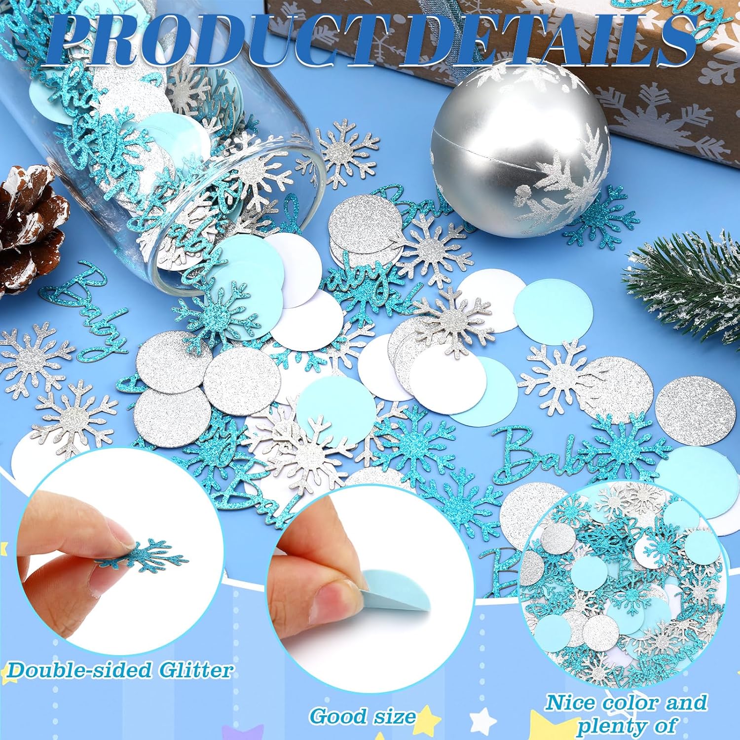 • Winter Shower Confetti: Baby shower confetti, with a total of 200 pieces blue baby shower confetti. Contains a variety of styles, such as snowflake, round, and the word "Baby". Different styles is reasonably matched, which can fully meet the needs of baby shower scene layout, easily complete the decoration task, winter baby shower decorations help you create a beautiful winter desktop decoration