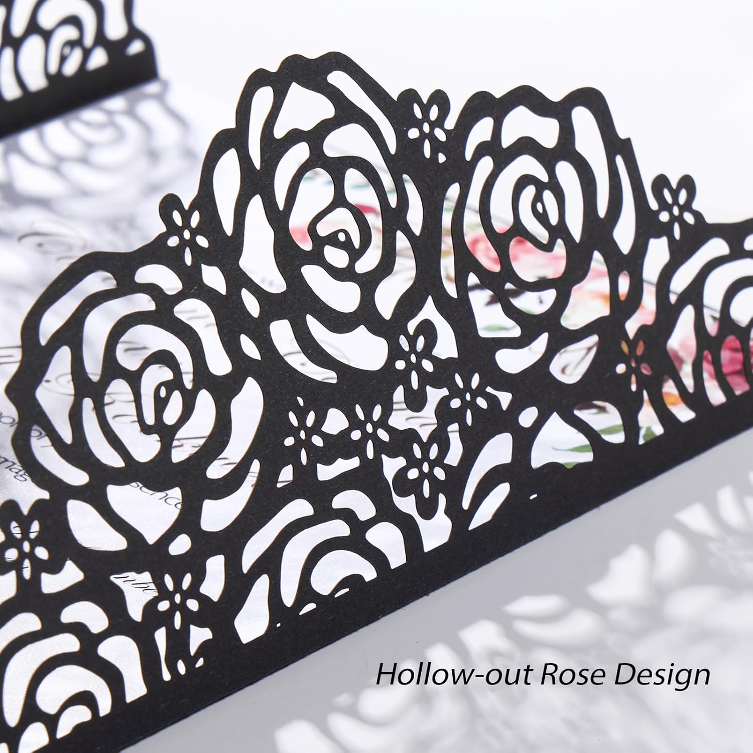• Size: black laser cut invitations cover 4.9''x7'', invitation paper 4.7''x6.9'', rsvp card 4.7''x3.4'', white envelopes 5.4''x7.7''. If you don't use our inner cards, kindly confirm the size before ordering!