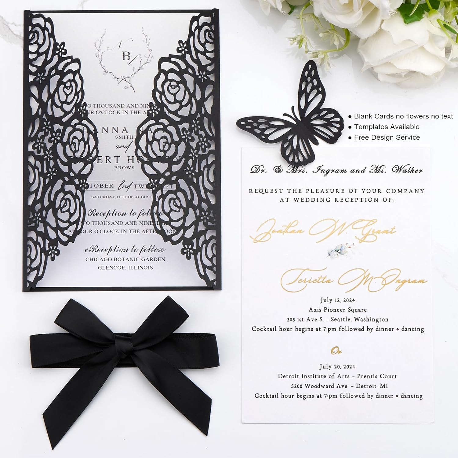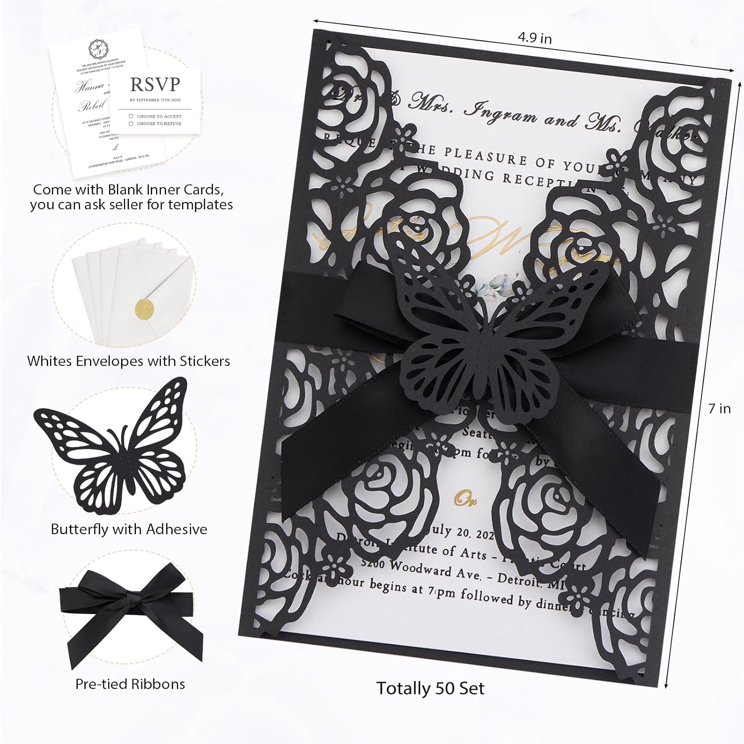 • Wedding Invitation Accessories: 50 x black invitation sleeves laser cutting, 50 x totally blank invitations cards, 50 x totally blank RSVP cards, 50 x butterflies with adhesive, 50 x ribbons, 50 x invitation envelopes & seal.