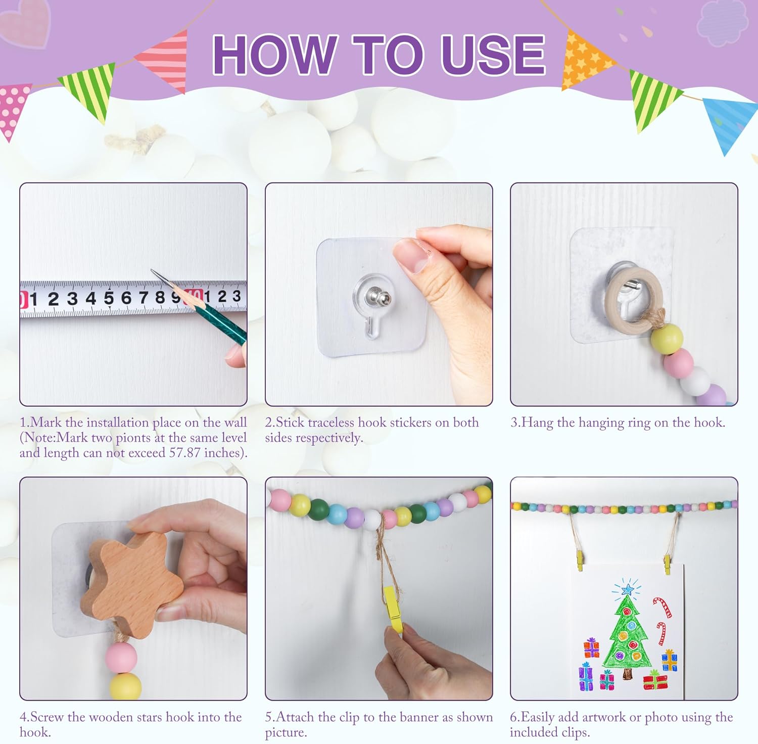 • Package: Total length of wooden bead garland: 59". It is equipped with 40 wooden clips(12 single clips with wooden beads+28 double head clips), 2pcs Wooden stars hook , 2pcs Traceless hook sticker, 2pcs Hardwall hanger garland which can show many children's artworks