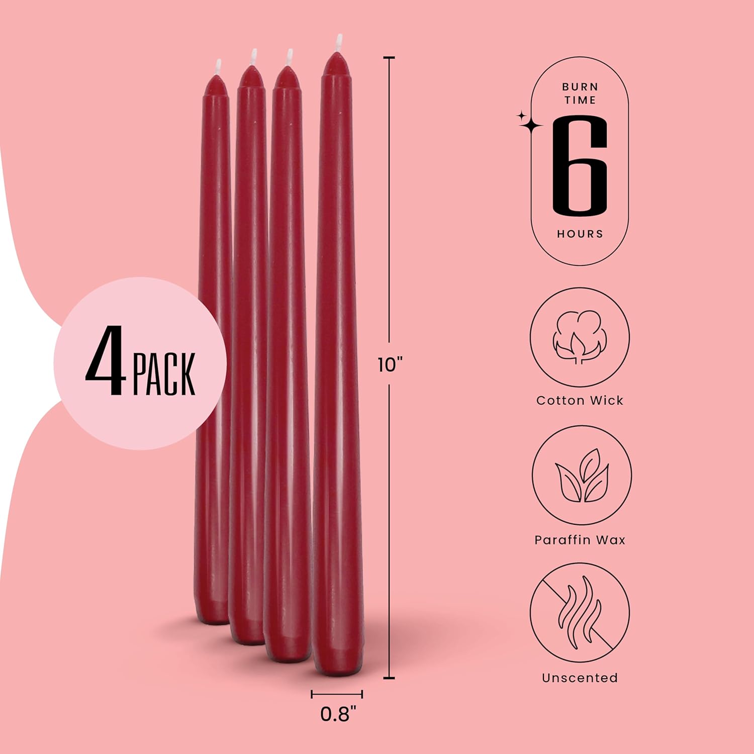 Leor & Lair Red Taper Candles for Christmas - 4 Pack 10" Dark Red Candlesticks - Unscented Long Burning Candle Sticks for Christmas Decoration, Thanksgiving, Dinner Table, Weddings