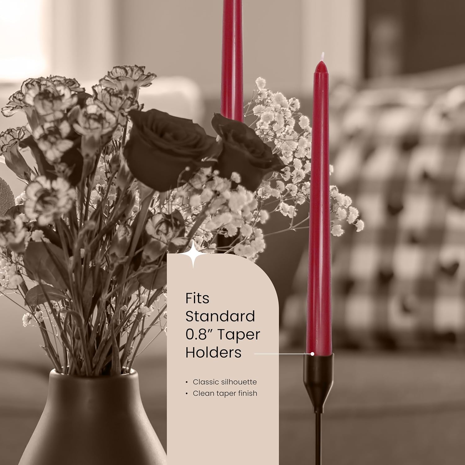 • Long-Burning Dark Red Candles – Each 10” tall taper burns for up to 6 hours of fragrance-free light, perfect for Thanksgiving tables, cozy fall evenings, or winter weddings where rich red candle sticks add warmth and depth to gatherings.