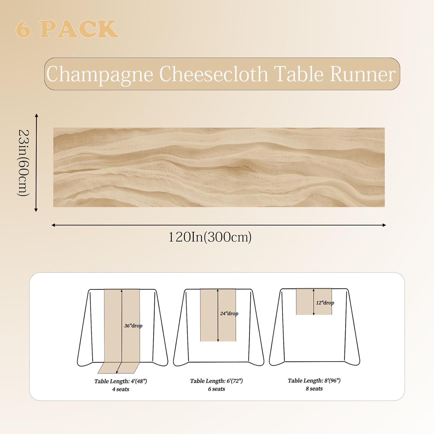 • 【Package Included】You will receive 6 pieces of cheesecloth table runners. Product size: Each boho table runner is 23 x 120 inches, Round or square tables for 8-10 people. Elegant and beautiful design, exquisite workmanship. Enough to cover rectangles and round tables, as well as long tables that are stitched together. It can even be used to belt chairs decorate napkins, background curtains, chair cover sashes, backdrop draping or even gift wrapping.