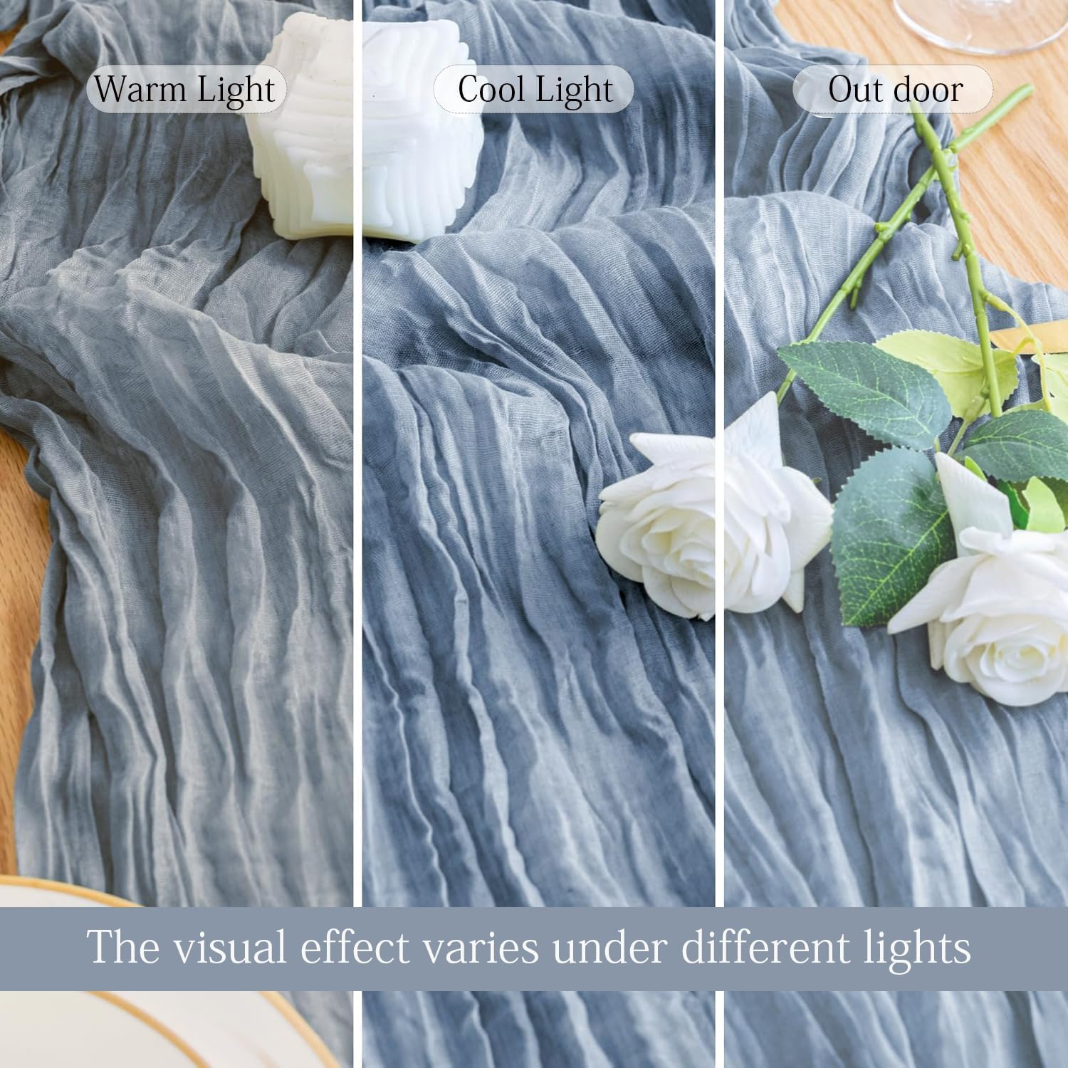 • 【Premium Material】The dusty blue cheesecloth table runner is made of high-quality gauze fabric. Carefully sewn, delicate edge, not easy to lose thread, not easy to decolorize, lightweight and skin-friendly. They come twisted up, so when you unwrap them you can stretch and smooth them out as much as you'd like, or leave them more bunched and crinkly. These cheesecloth table runners compliment the floral arrangements & centrepieces without competing for space- the perfect textural addition and bring an upscale style to your decorations.