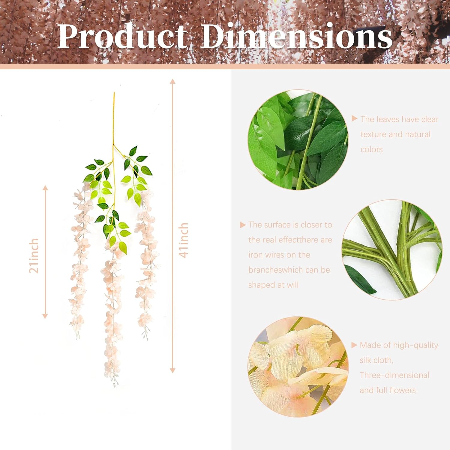 • 【Package Included】24 pieces of champagne&pink silk hanging flowers, each length 41 inches. Every artificial wisteria garland has 3 branches and 6 leaves, the wisteria flower petal length is 21 inches. (Note: There is a little green in the middle of the petals, If the petals fall off, you can install it according to the instructions or contact us by email if you have any questions.)