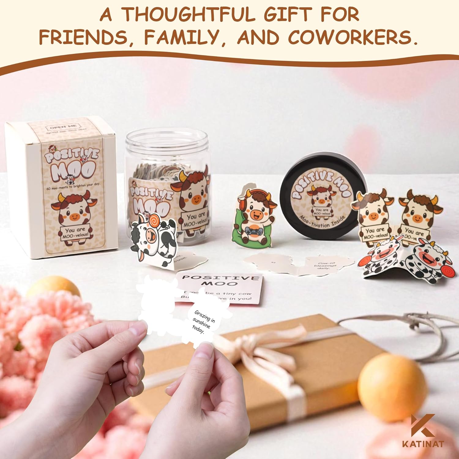 • ✨ Cute Cow Affirmation Jar – Unique Cow Gifts for Women Surprise someone special with the Positive Moo Jar, filled with 60 uplifting affirmation cards in a charming cow print design. This isn’t just another cow themed gift – it’s a motivational jar packed with encouragement, making it the perfect way to send love, laughter, and daily positivity to friends, family, or even yourself.