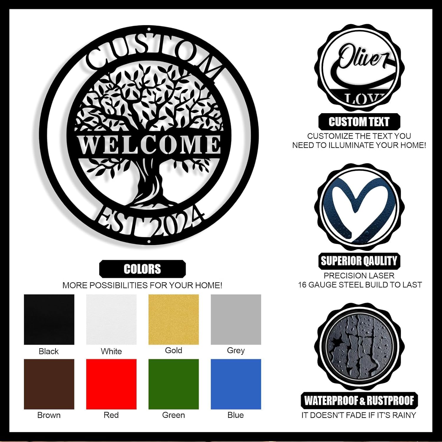 • Personalized & Name Customizable -- Click "CUSTOMIZE NOW" and enter the name or text. Our personalized Tree of Life Metal Sign designs make it unique, beautiful and elegant to create a perfect personalized family name sign for you. This custom last name sign is customized with your last name, first names and established date, will look beautiful indoor and outdoor any home.